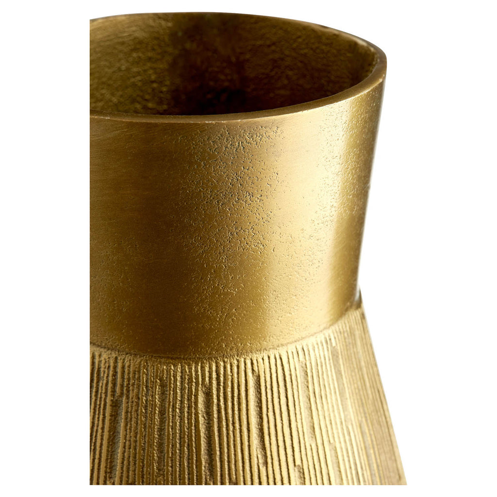 The Aria vase adds a decorative and functional touch to any room’s d?cor. Its elegant, textured body paired with its smooth fluted top and tapered bottom lend visual intrigue and elevate any atmosphere. Stage the Aria vase alone, or complement its pristine gold finish with foliage. Gold-finished aluminum | Contrasting smooth and textured surface | Not water tight | Use with a liner