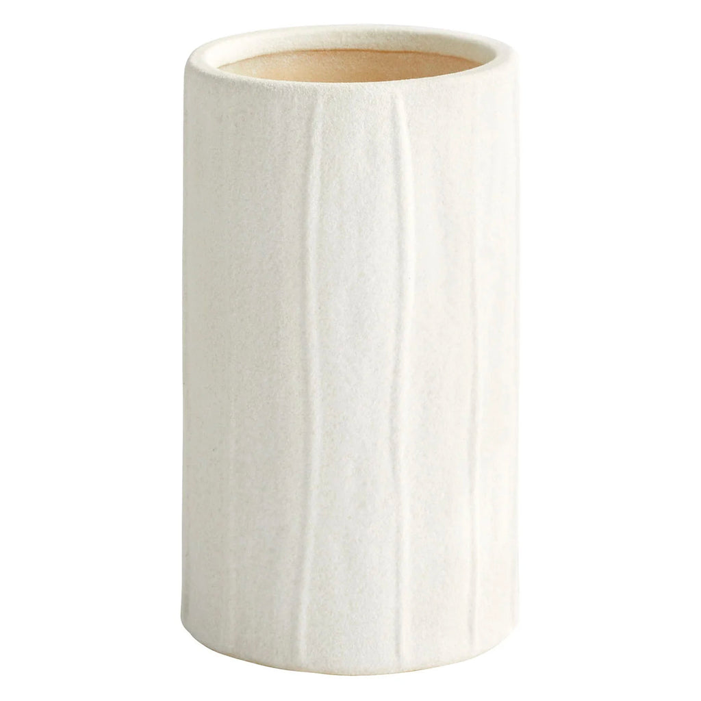 The Cyan Design Astreae Cylinder vase are forged from ceramic with a white finish. A sand-like texture and subtle linear pattern give this series a look that is allusive to a Grecian retreat. Place altogether in an entryway or individually atop an accent table in your dining room. Three sizes are available.