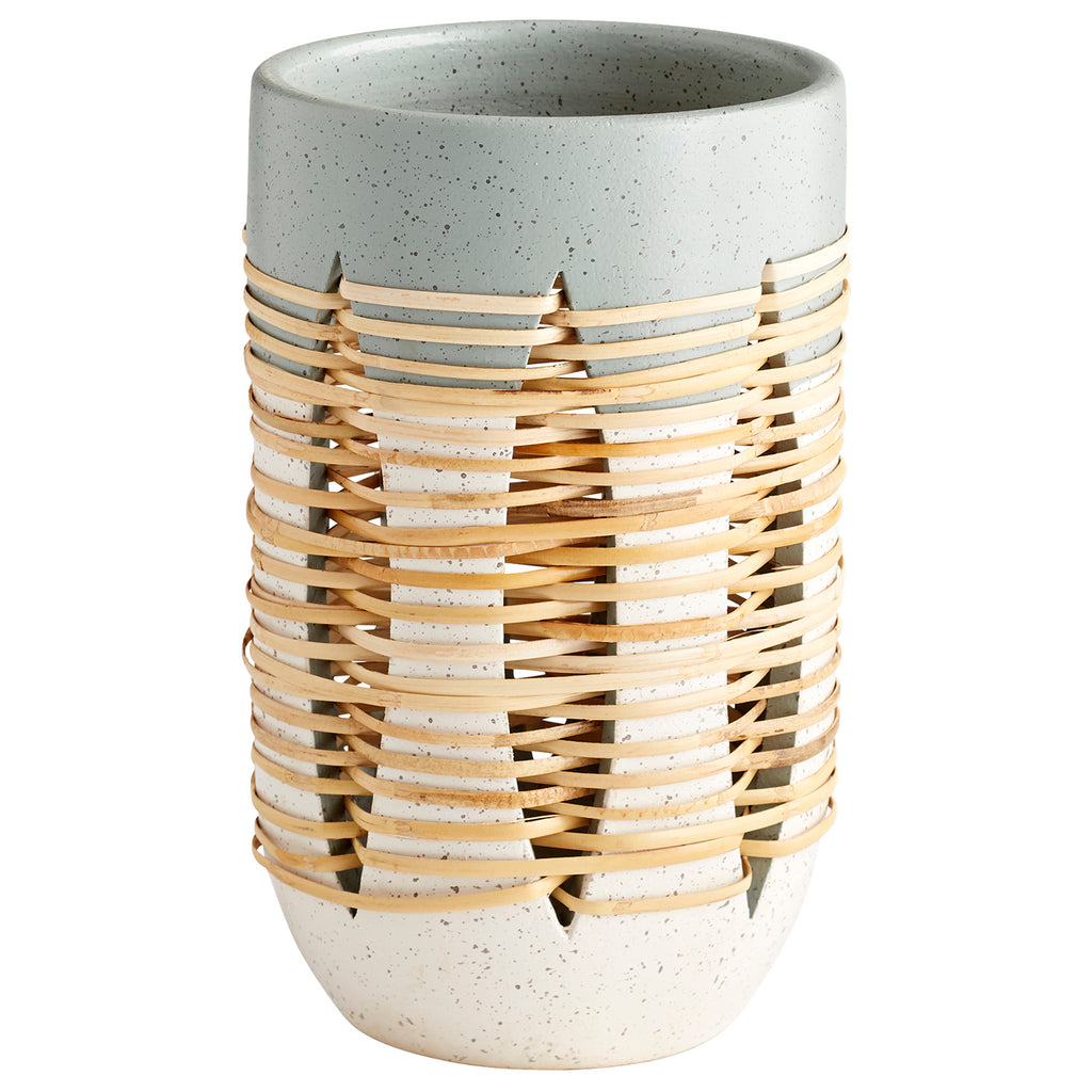 The Crescent vase is a gorgeous synthesis of materials. Its two-tone monochromatic finish is juxtaposed with an intricate weaving of wicker in between multiple hollowed crescents that encircle the body. Simple and compact for indoor spaces.