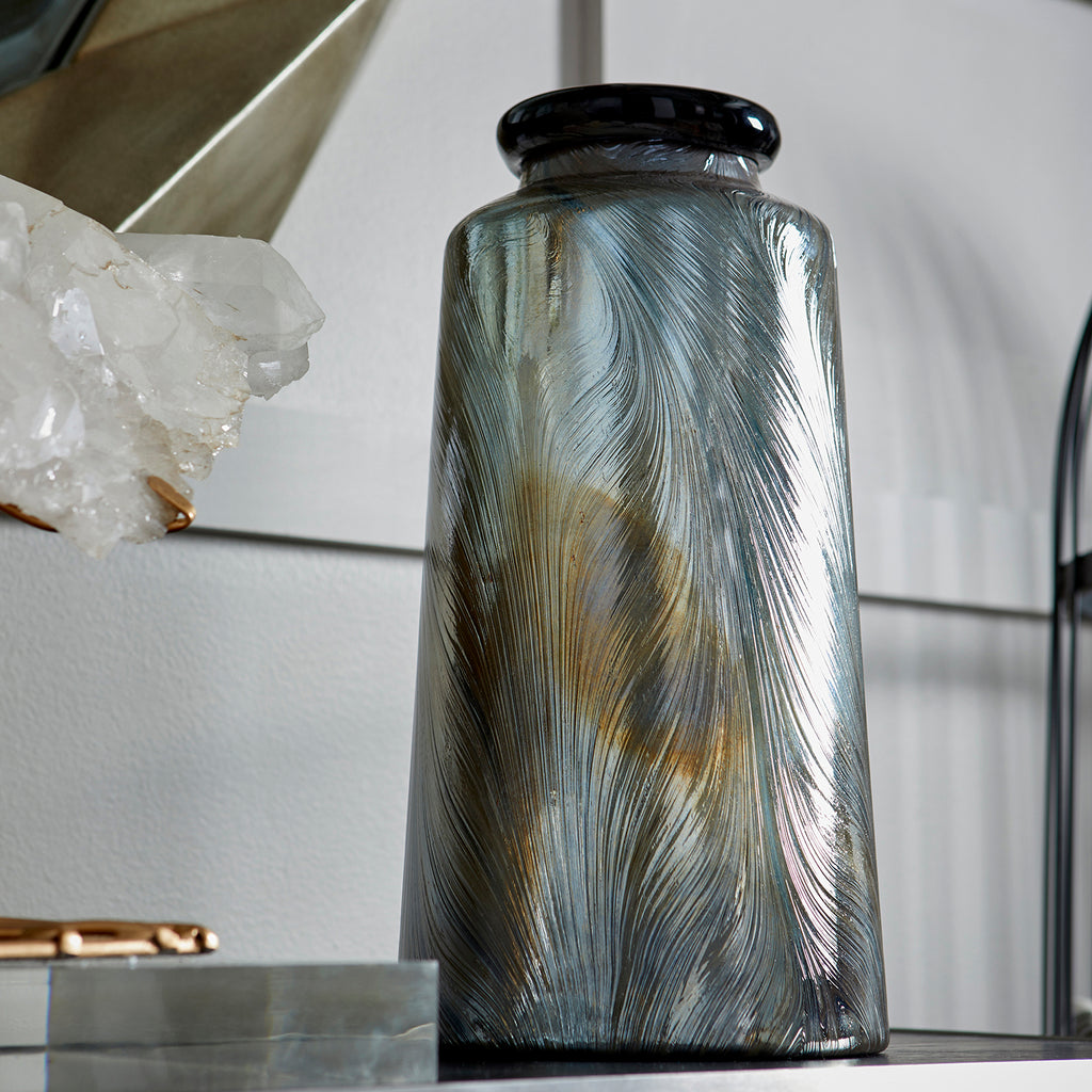 Update your home’s look, add a pop of color to your tabletop ensemble with the Cypress vase. Available in three different size options, these colorful accents feature wavy colorations in a Damascus grey, gradient finish. These contemporary vessels are ideal for your spring floral arrangements. Perfect for any style design: contemporary, traditional, or transitional, these glassware pieces will fit your needs.