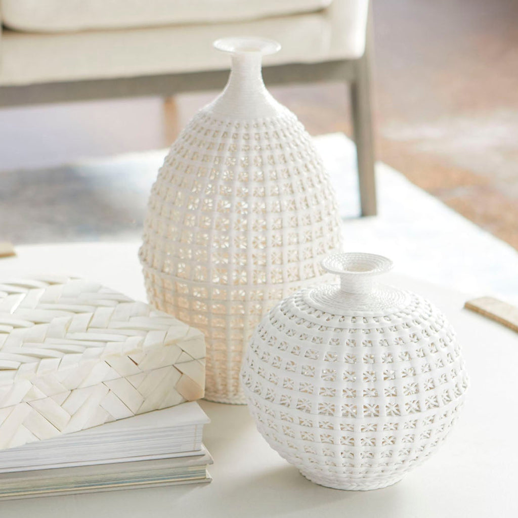 Update your home’s look, add an artistic design to your tabletop ensemble with the Diana vase. Available in two size options, these subdued white cross hatched accents, feature an open air frame from top to bottom. These contemporary vessels are ideal for your spring floral arrangements. Perfect for any style design: contemporary, traditional, or transitional, these white and cream glaze ceramic pieces will fit your needs.