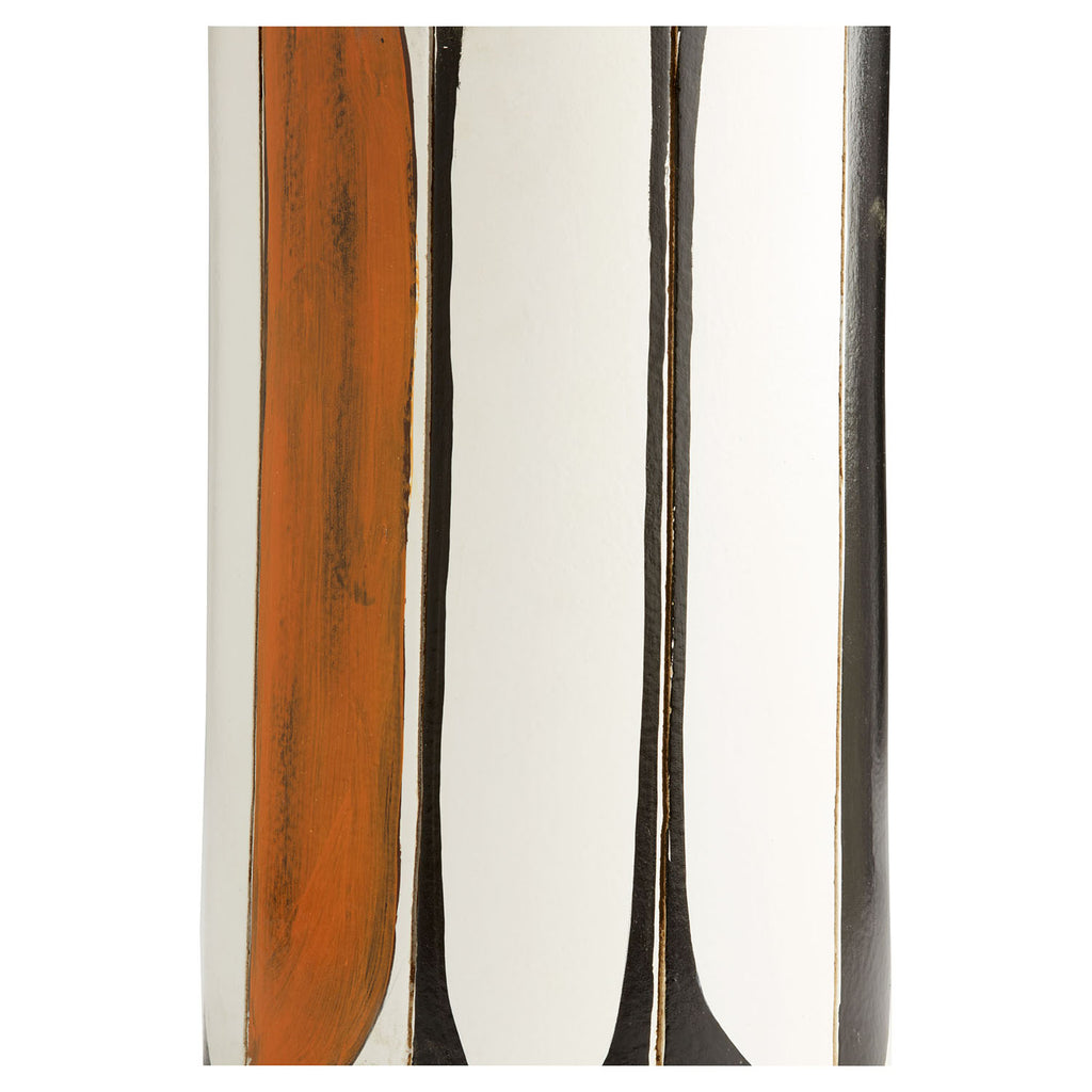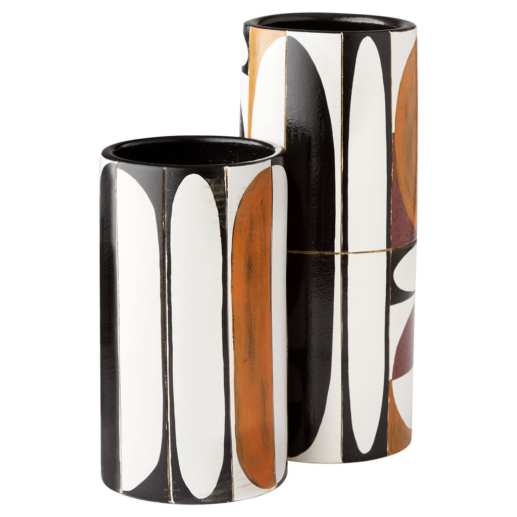 A modern mixture of geometric shapes displayed on the glazed ceramic pair of Sakura vases makes the them an exceptional addition to any contemporary space. The bronze, rust, and brown colors balance each other out against a contrasting off-white backdrop. Black glazed interior. Strong enough to stand on their own or be adorned with fresh or faux foliage, these versatile vases make a statement in any atmosphere they reside. Modern geometric influences | Vertical, contrasting stripes | Black glazed interior | Handcrafted Ceramics