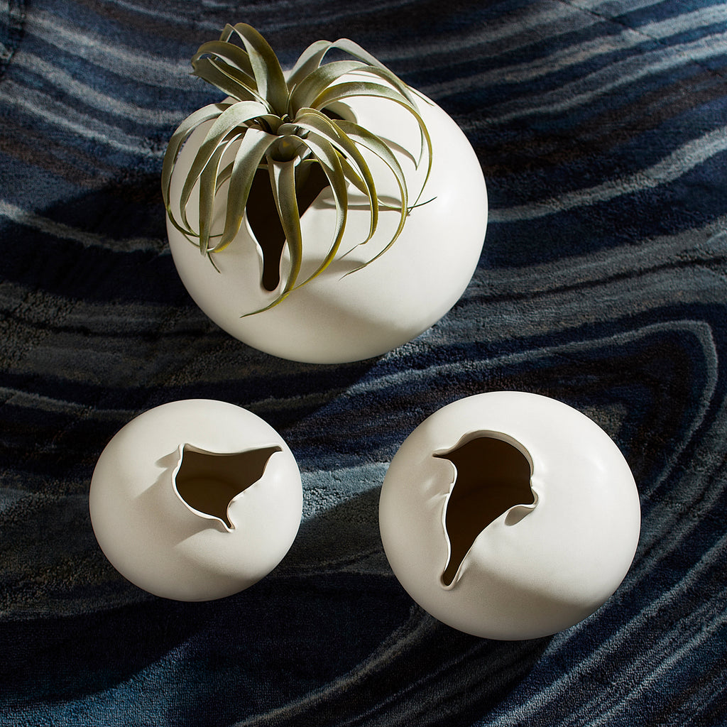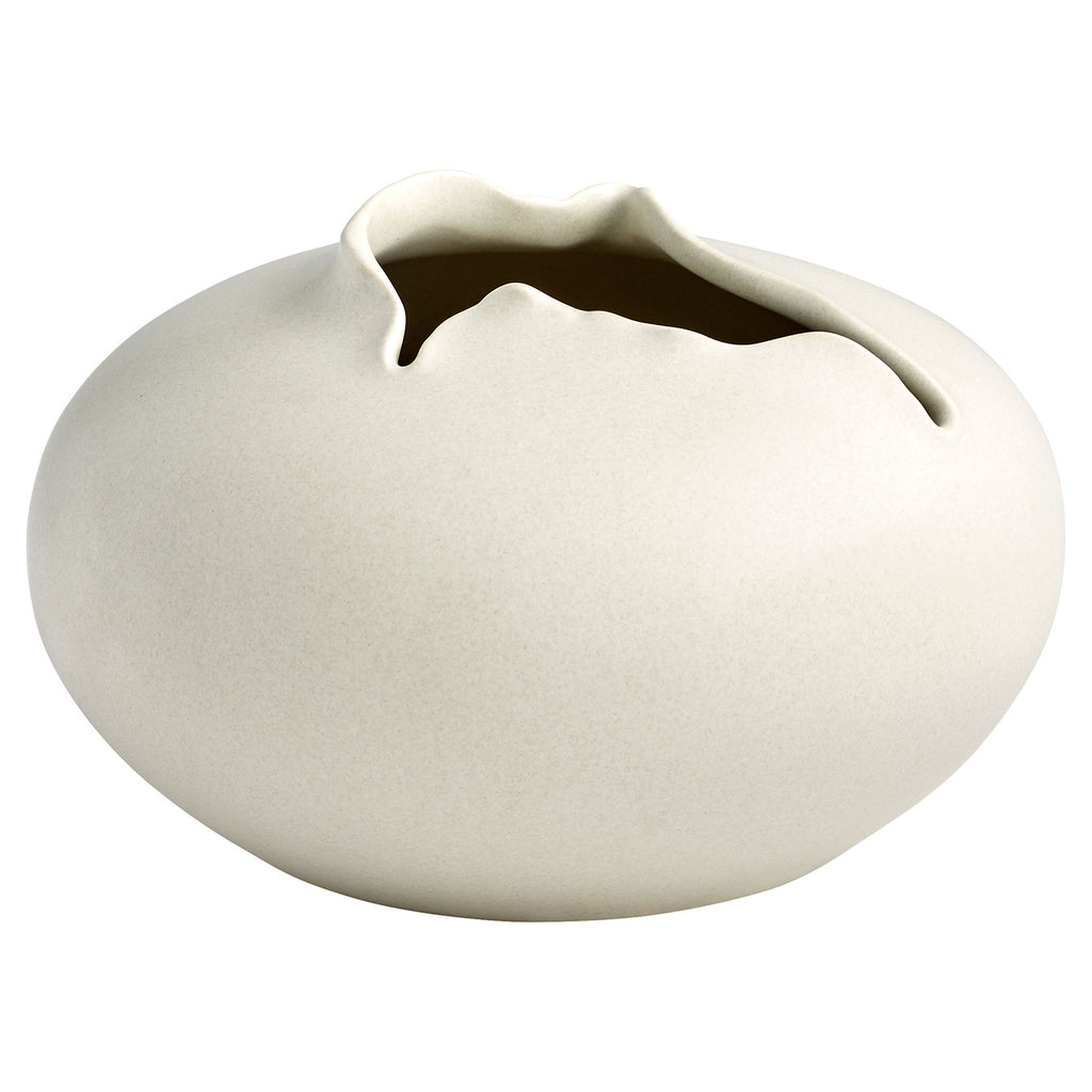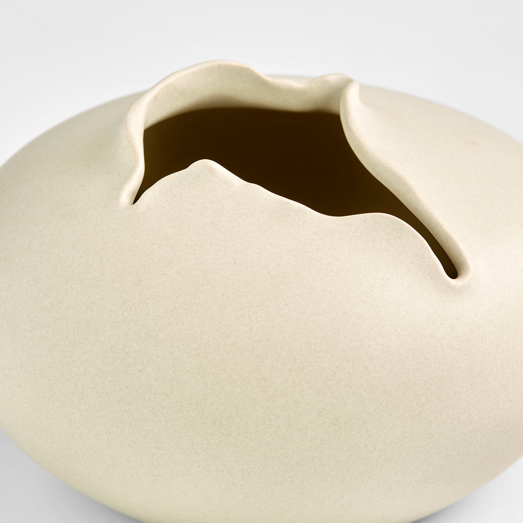The distinct characteristic that sets the Tambora vase collection apart is the amorphous opening atop a rounded, low profile. The surrealistic shape echoes that which might be found untouched in nature. The off-white glazed ceramic body is watertight, allowing for the display of fresh or faux flora.