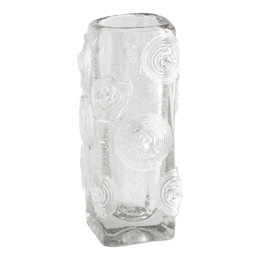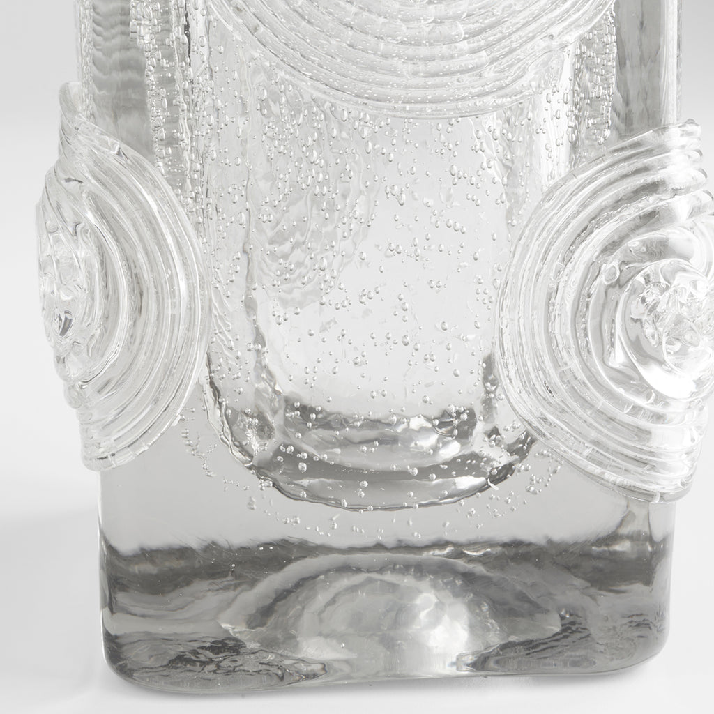 This rectangular prism glass vase is layered with captivating swirls of clear glass. Thick glass is blown with tiny bubbles trapped encased, providing texture and intrigue. With an impressive height, the Tantalus vase is an ideal vessel for many applications. Use as a centerpiece in a dining room or start a conversation by placing atop a living area coffee table. Water-tight. This product, or portions of this product have been hand crafted by artisans. Each piece is unique and can vary in finish, tone, texture and color.