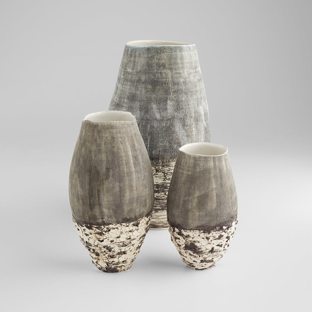 Taken from hand-thrown originals created by internationally recognized ceramicist Ani Kasten, the Calypso vases’ trademark quality is the material used in production. Aligning with Ani’s practice of sustainably sourcing her materials around her home in Shafer, Minnesota, a proprietary blend of natural and recycled components is bound together to create a strong alternative that is biodegradable and eco-friendly. Casting is done by skilled artisans using timeless craft traditions of the desert. The Calypso collection of heavily textured off-white and brown ombre rough-hewn vases capture the essence of nature while remaining grounded in luxury design.