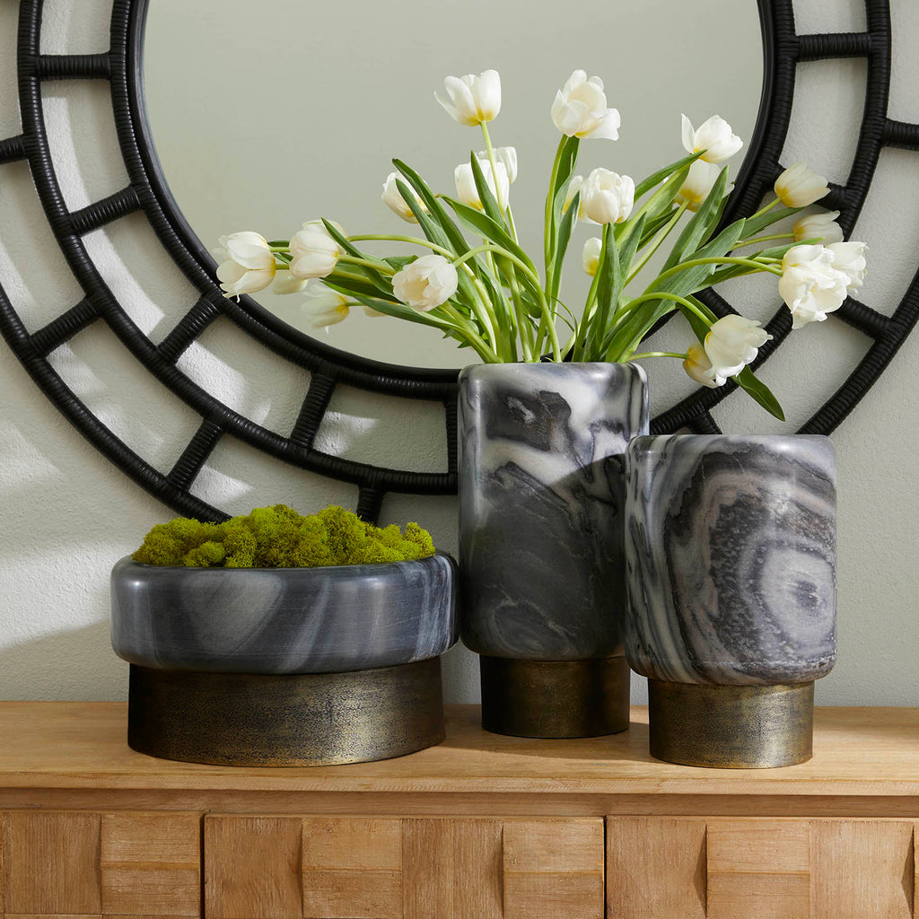 The Roma Collection of vases and bowls proudly presents massive hand-hewn marble pieces that encapsulate the remarkable beauty of Kayampura marble, a native Indian stone renowned for its captivating veining. Each unique piece rests atop an antique nickel-finished, cast aluminum plinthe base. The Roma Collection is a testament to the enduring appeal of artistry and the beauty of natural materials.