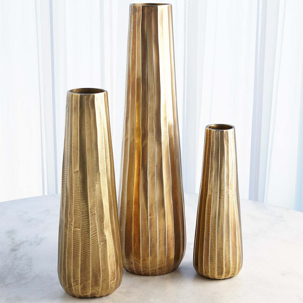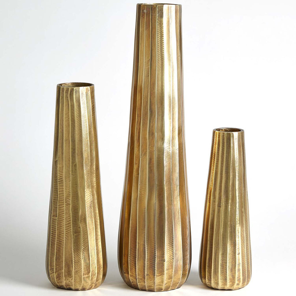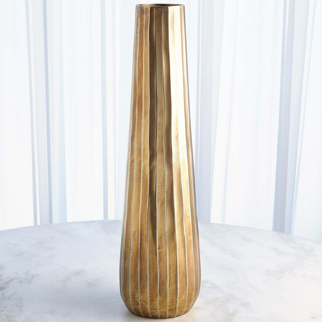 The Global Views Chased Round Vase is made of chiseled aluminum with an antique brass finish.