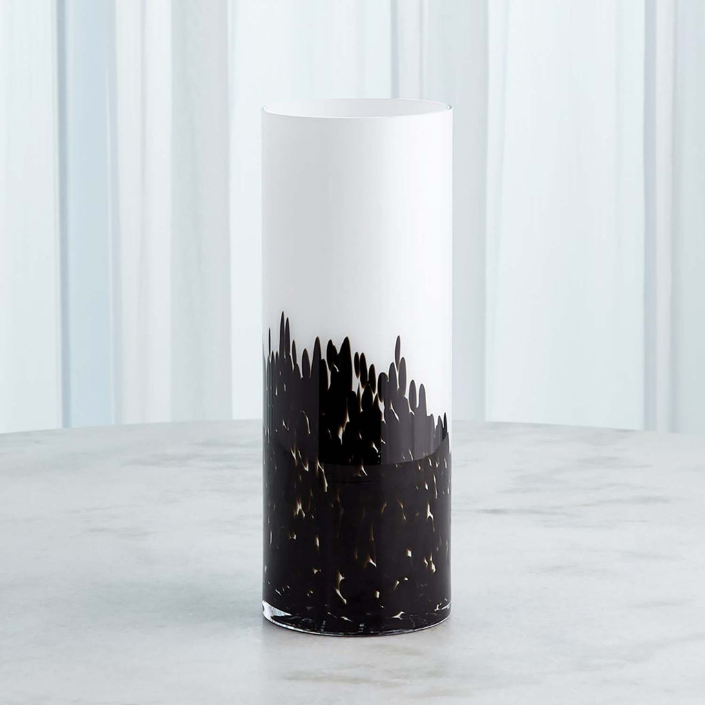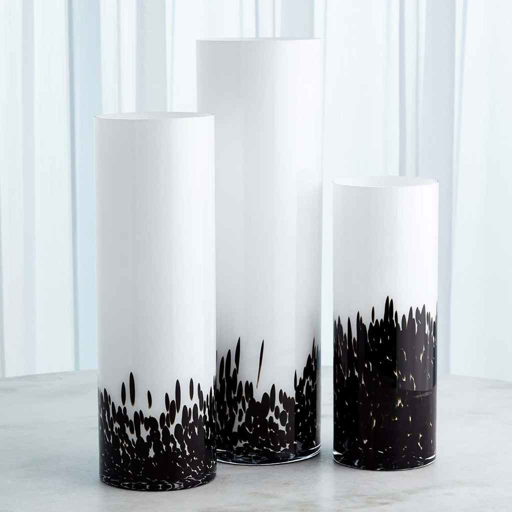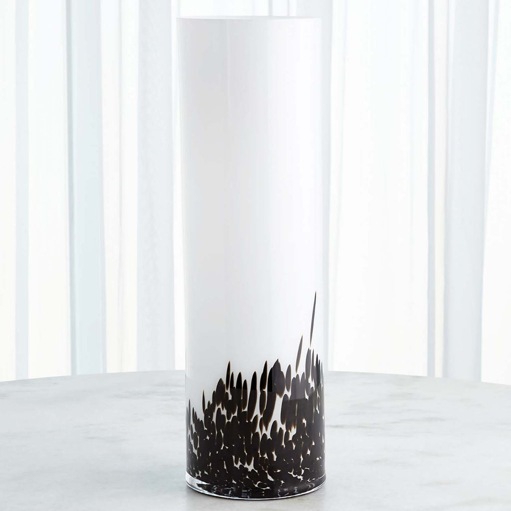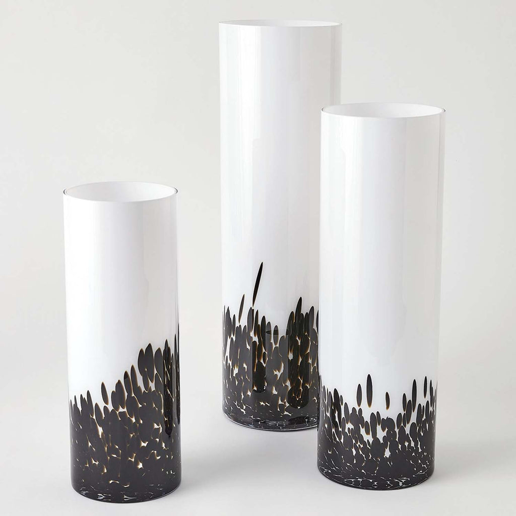 The Global Views Confetti Vases are crafted of white and clear Polish cased glass with a black confetti glass exterior layer.