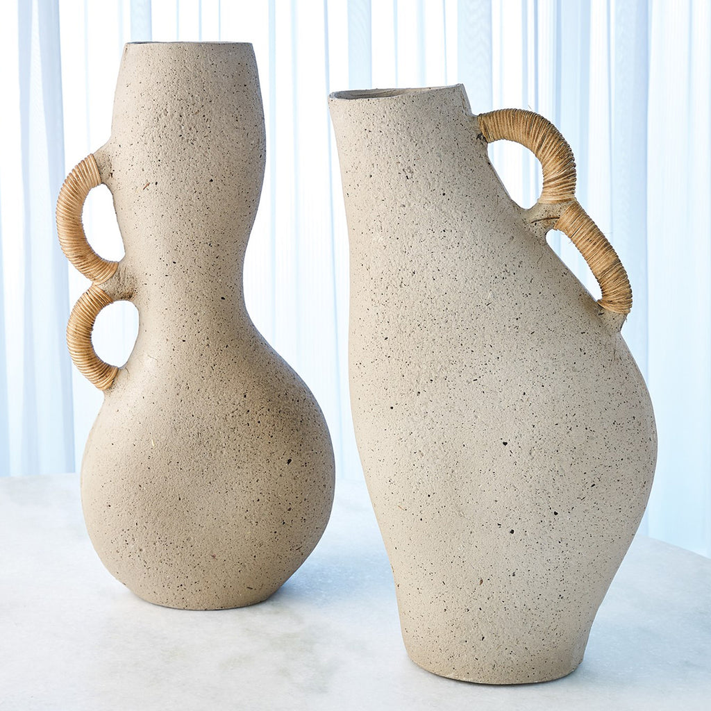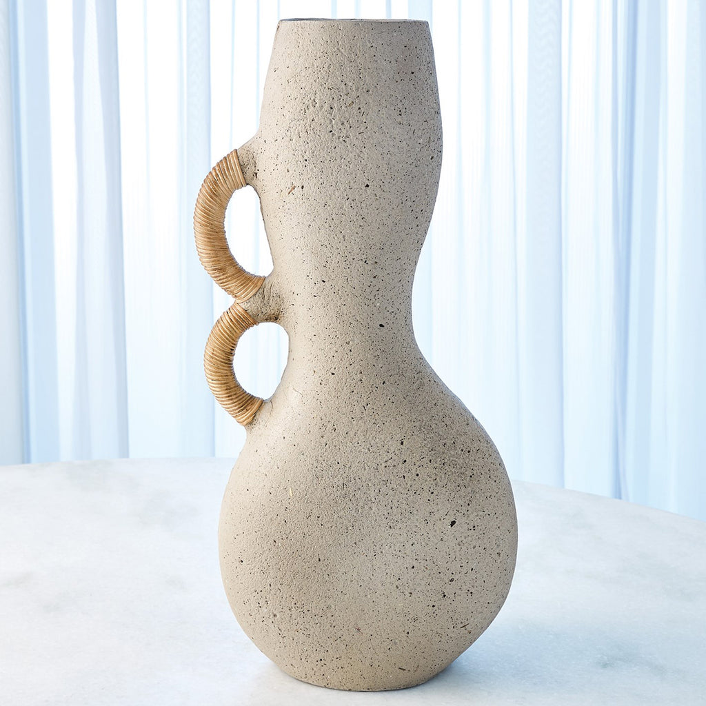 Our Global Views Hourglass Vase is made of Ecomix and has rattan wrapped handles.