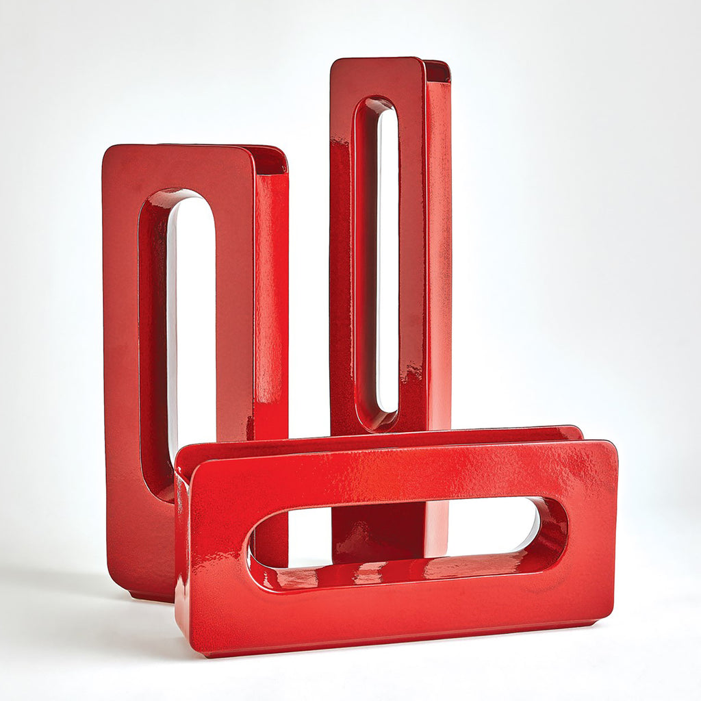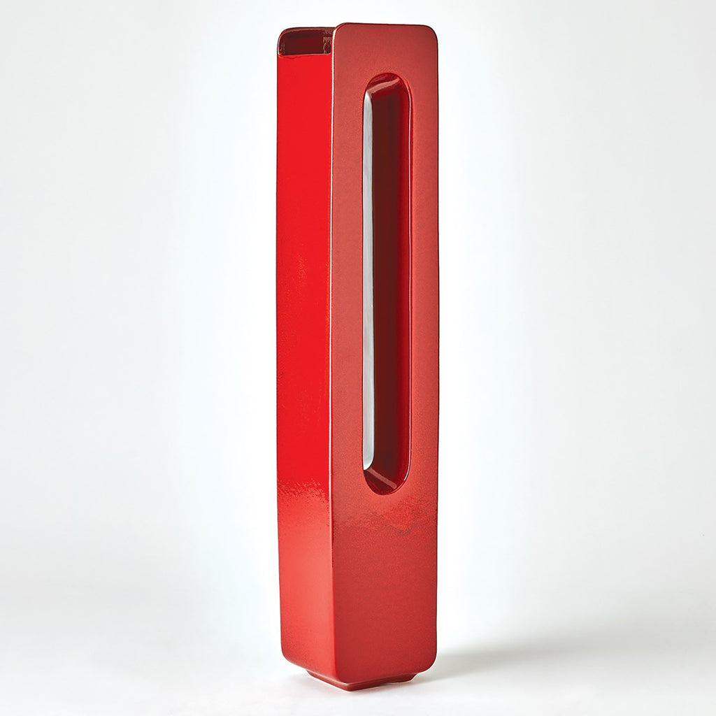 These statement vases are made of Portuguese slip-mold ceramic with rounded edges and are available in deep red.