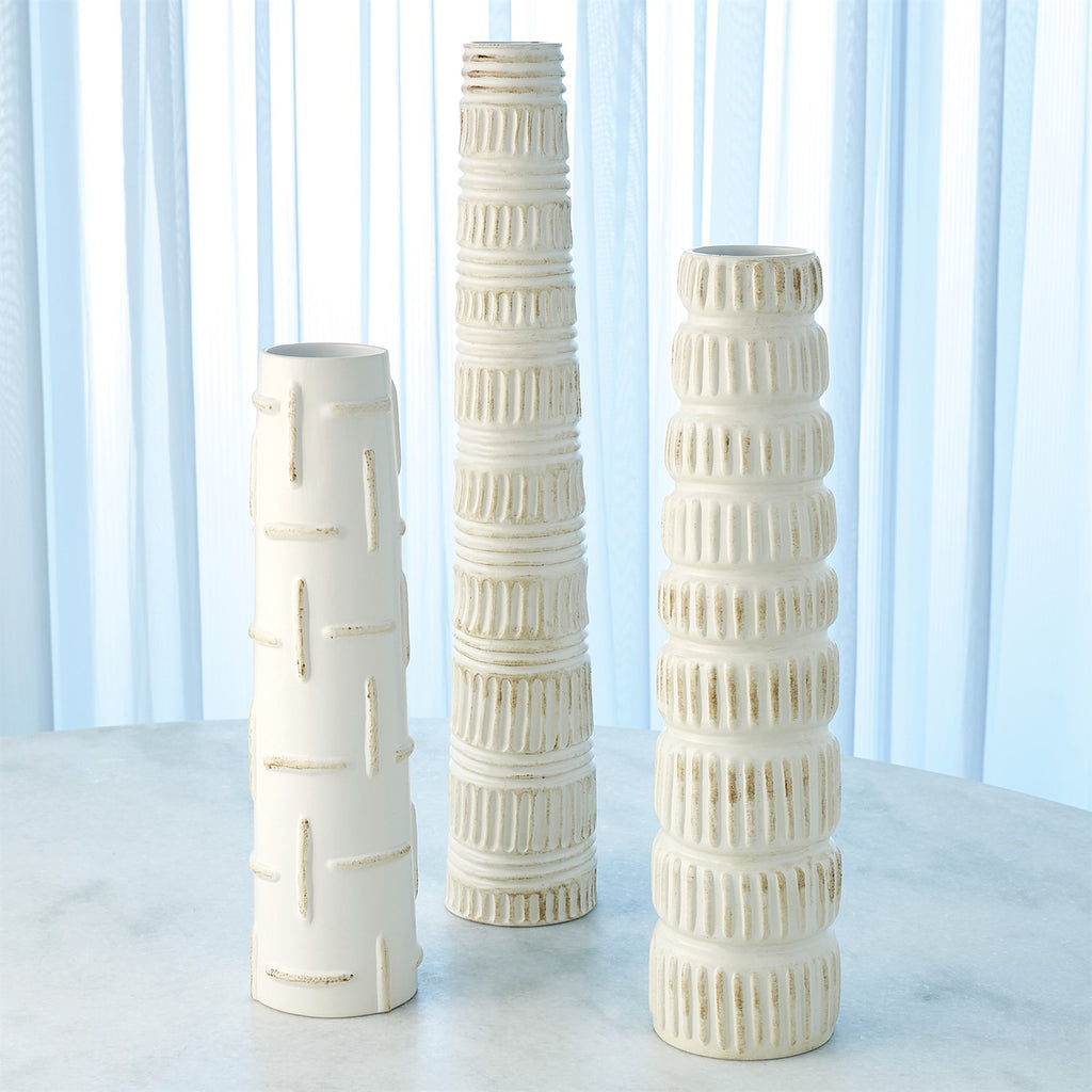 The ornate Global Views Totem Vase Collection is slip cast Portuguese ceramic with hand applied highlights.