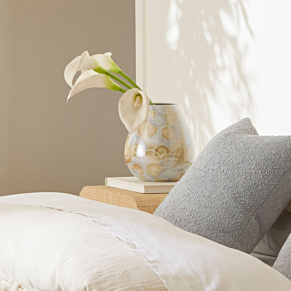 Created by master artisans, these lovely ceramic vases exude an air of tranquility. Their finish combines a warm natural tone with a cooler shade of blue, while striking patterns are achieved through the careful application of designs and multiple firings. They are beautiful enough to display on their own, yet versatile enough to use with your favorite fresh or faux fillers.