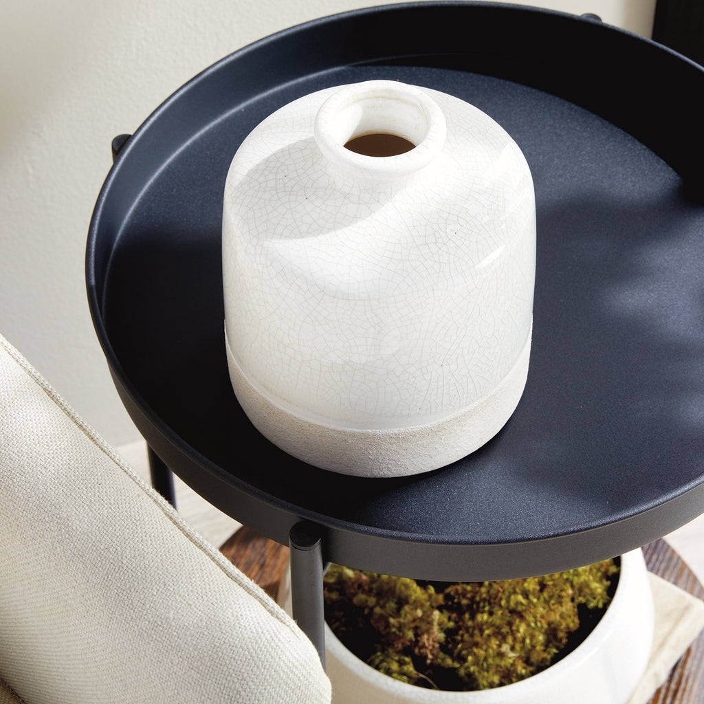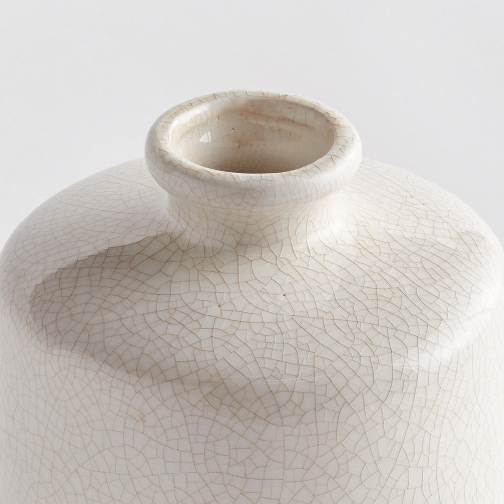 In the perfect shade of warm white and finished in a crackle glaze, this bottle vase adds a subtle sophistication to any space. The raw clay base is the natural touch that grounds the piece. Add some faux stems for height, or display just as is.