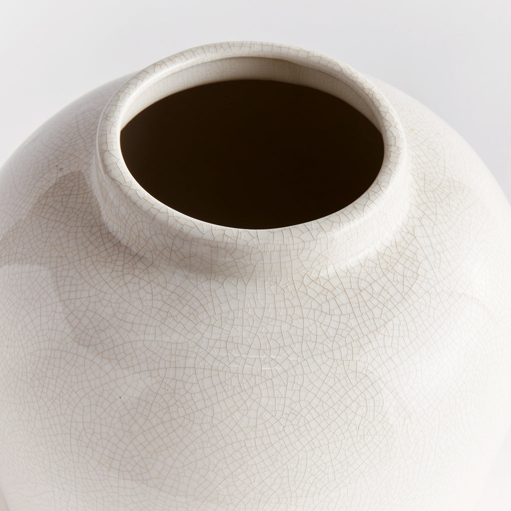 In the perfect shade of warm white and finished in a crackle glaze, this wide vase adds a subtle sophistication to any space. The raw clay base is the natural touch that grounds the piece. Add some faux stems for height, or display just as is.