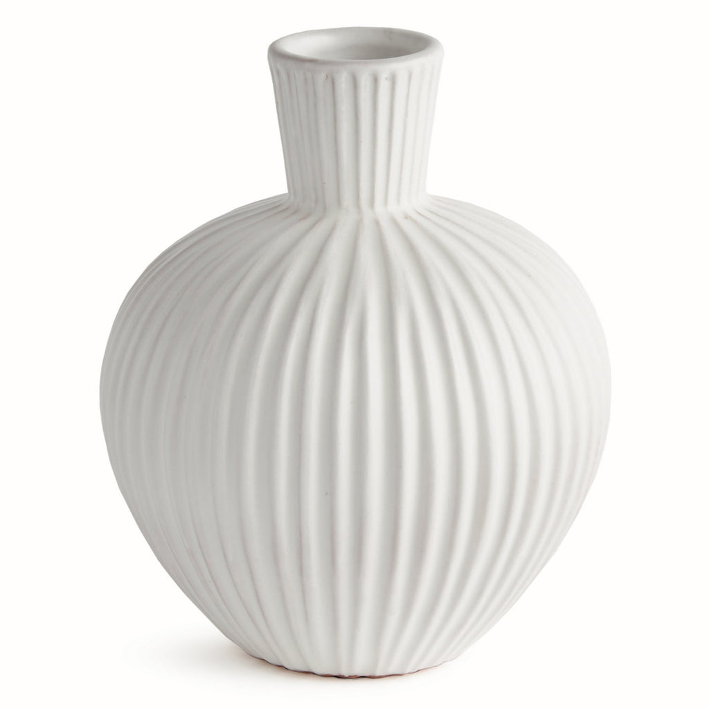 This bottle shaped, ribbed vase is a sweet little accent for bookshelf, desk or kitchen counter. Add a single faux stem for a pop of color.
