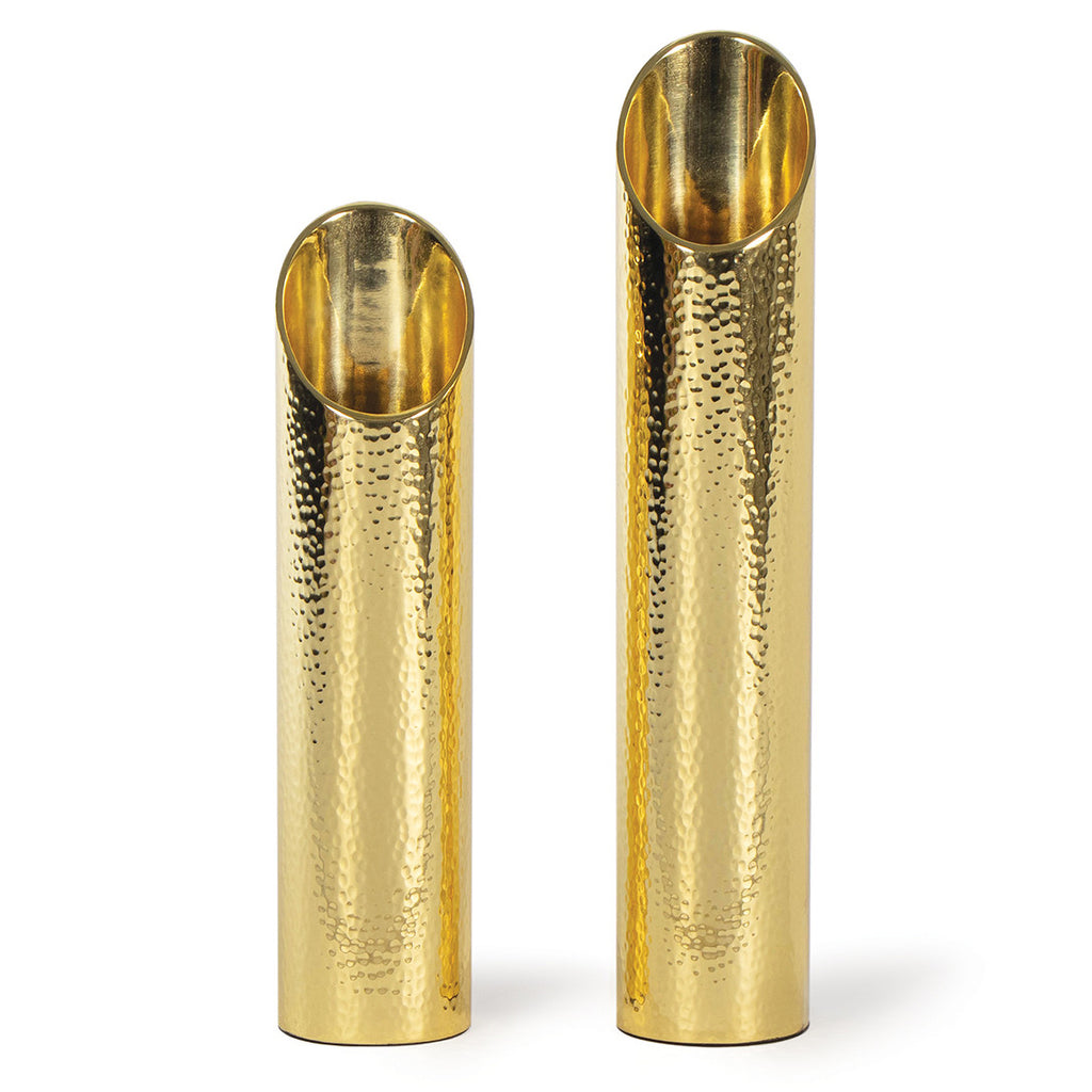 The Elio Vase Set shines with a polished brass, hammered finish. These chic cylinders can shine on their own, or elevate the look of branches or cherry blossoms.