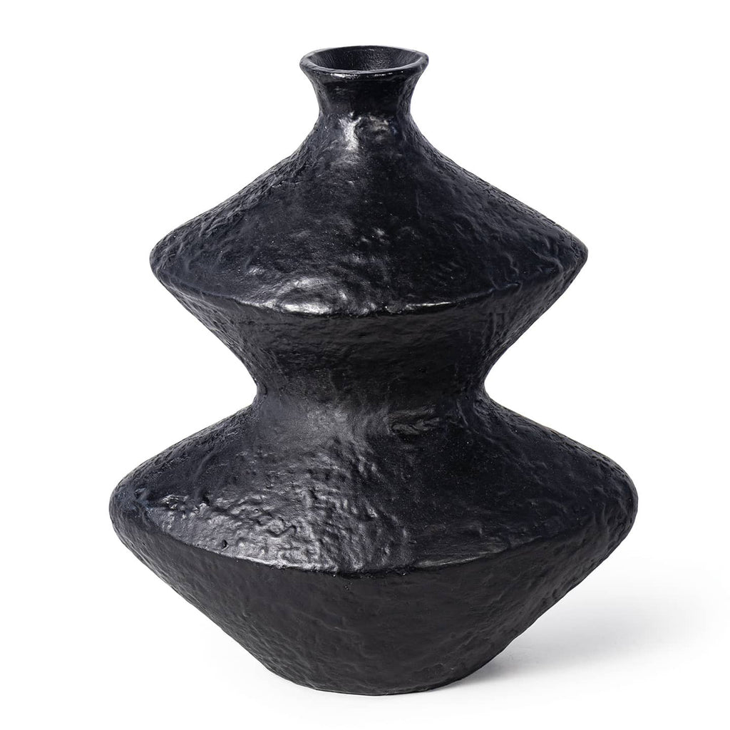 The Regina Andrew blackened plaster finish of our Poe Vase is mottled with texture that is crafted to have an artisan, handmade feel. Place this sculptural, artistic vase as a contemporary centerpiece on a table, etagere or shelving unit.