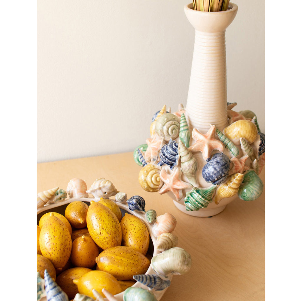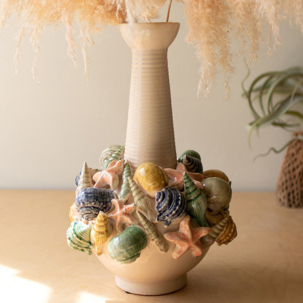 This bottle vase with a long neck has attracted all kinds of sea creatures to its base. Use this long-necked vase in your coastal space. It grooves with other coastal vibes, both neutral and multicolored.