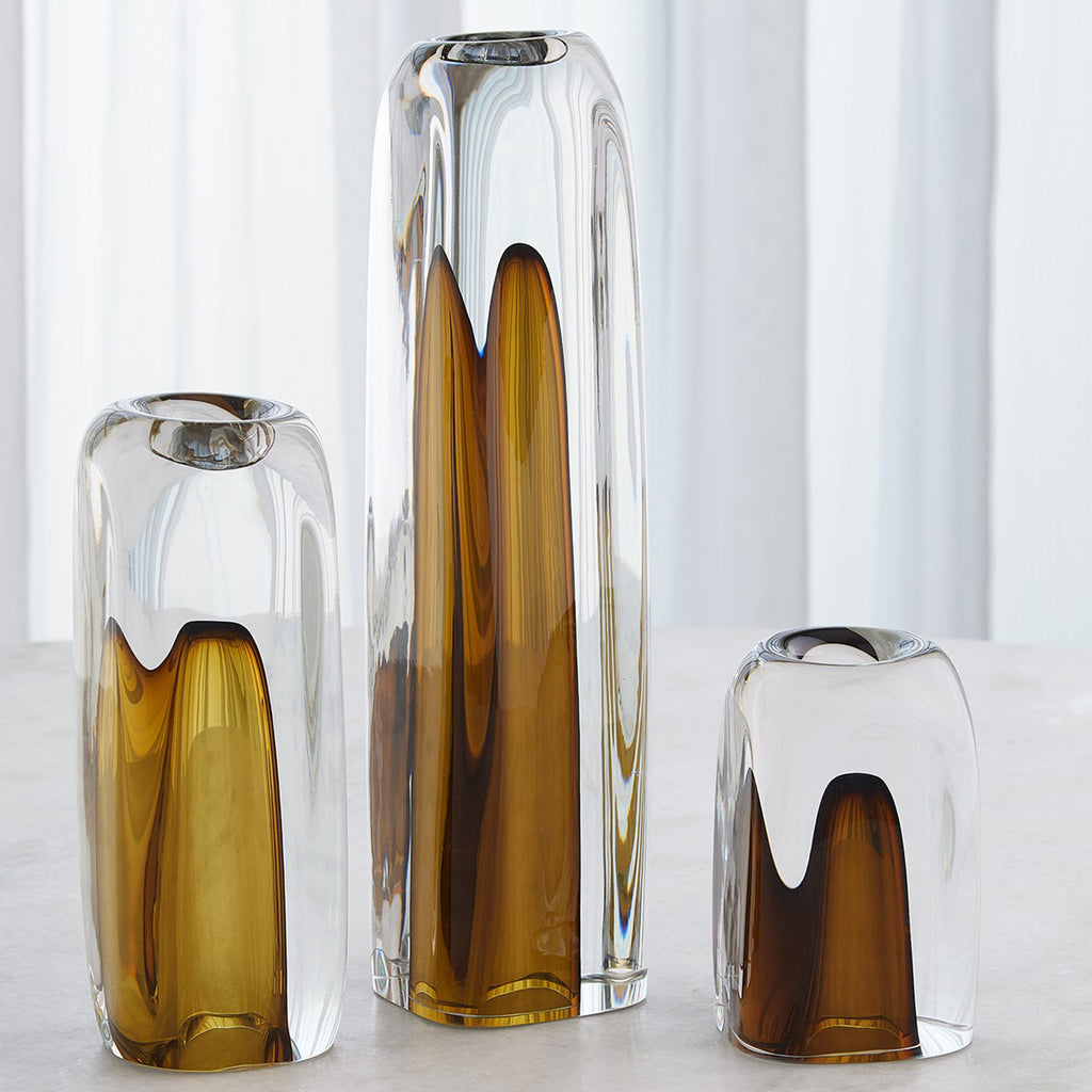 The Tower Tea Light Holders/Vases are crafted from hand-blown Polish art glass featuring encased colors achieved by layering moss green and clear glass. Versatile in design, these pieces can be used as elegant tea light holders or flipped to serve as striking vases, enhancing any space with their rich beauty.