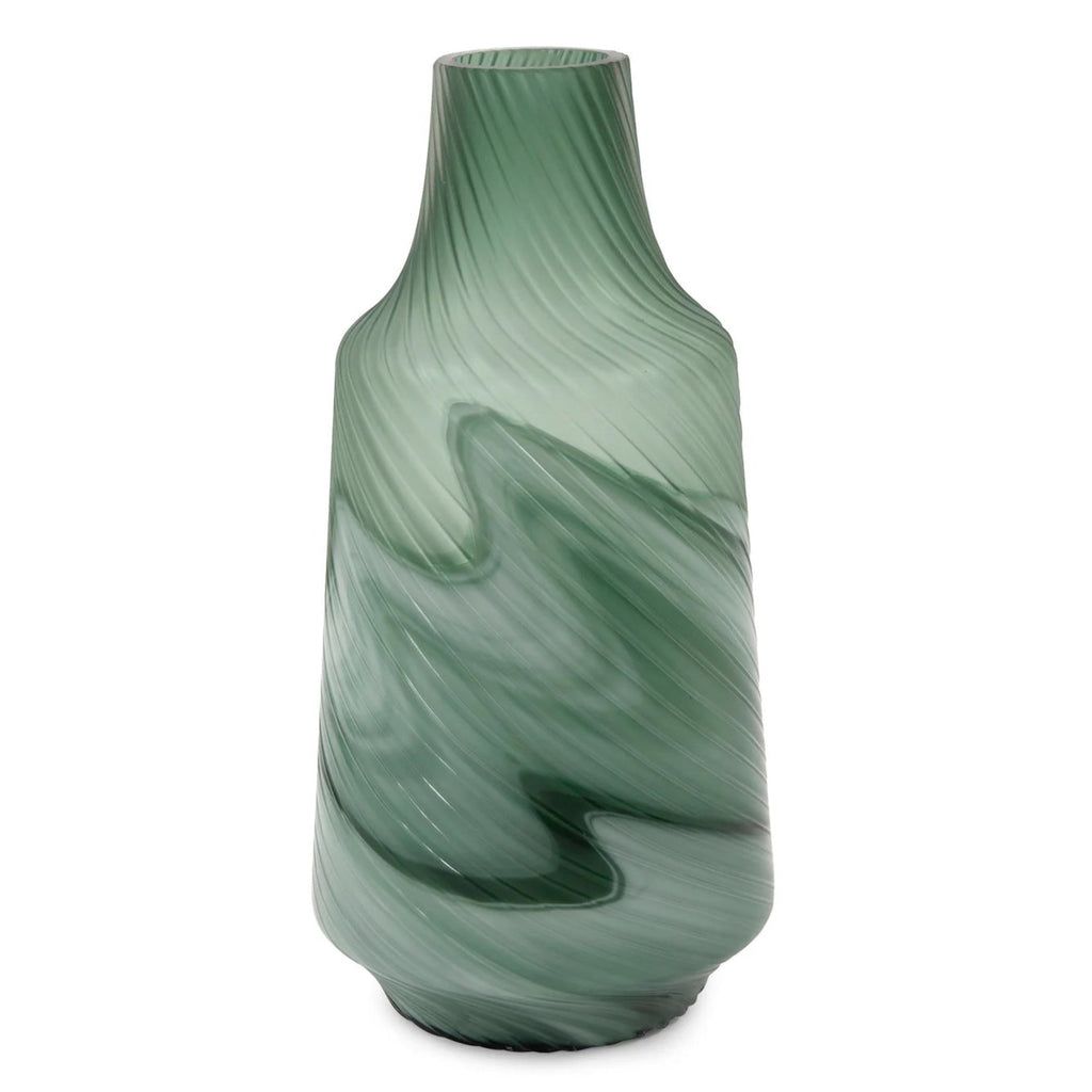 The teal color combines the calming properties of green with the renewal qualities of green. It is a revitalizing and rejuvenating color that we combined with a frosted top swirl texture and a fluid patterned base. The translucent and opaque finishes together highlight these vases quality and depth as a décor element.