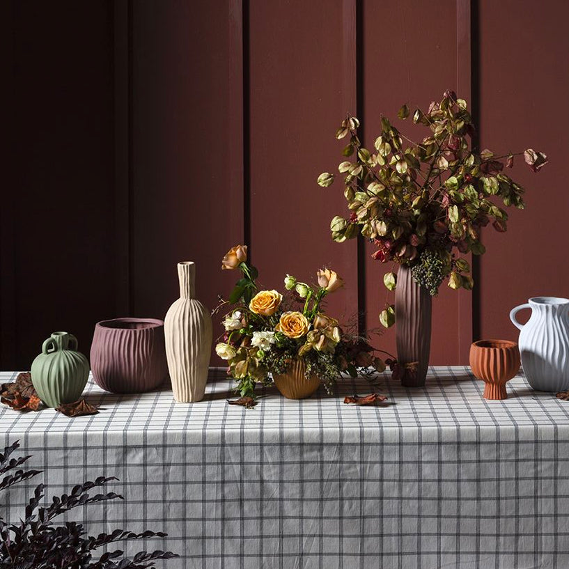 The Thayer collection is a striking vase in an earthy colors. All are deeply ribbed and have a matte finish. This collection is can be enjoyed as a grouping of decorative objects, each one unique in shape and color. Each piece is also a functional and modern vessel for a Harvest inspired arrangement.