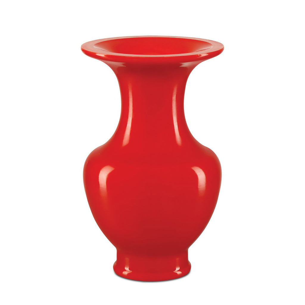 The Currey & Co Bittersweet Peking Vase is made of unique layered glass, a complex process of blowing, carving then dipping multiple times. . The wonderful deep coral orange was a special color during the Ming Dynasty, as it historically represented fire and desire, and was highly prized in the emperor's palace for its brilliance.