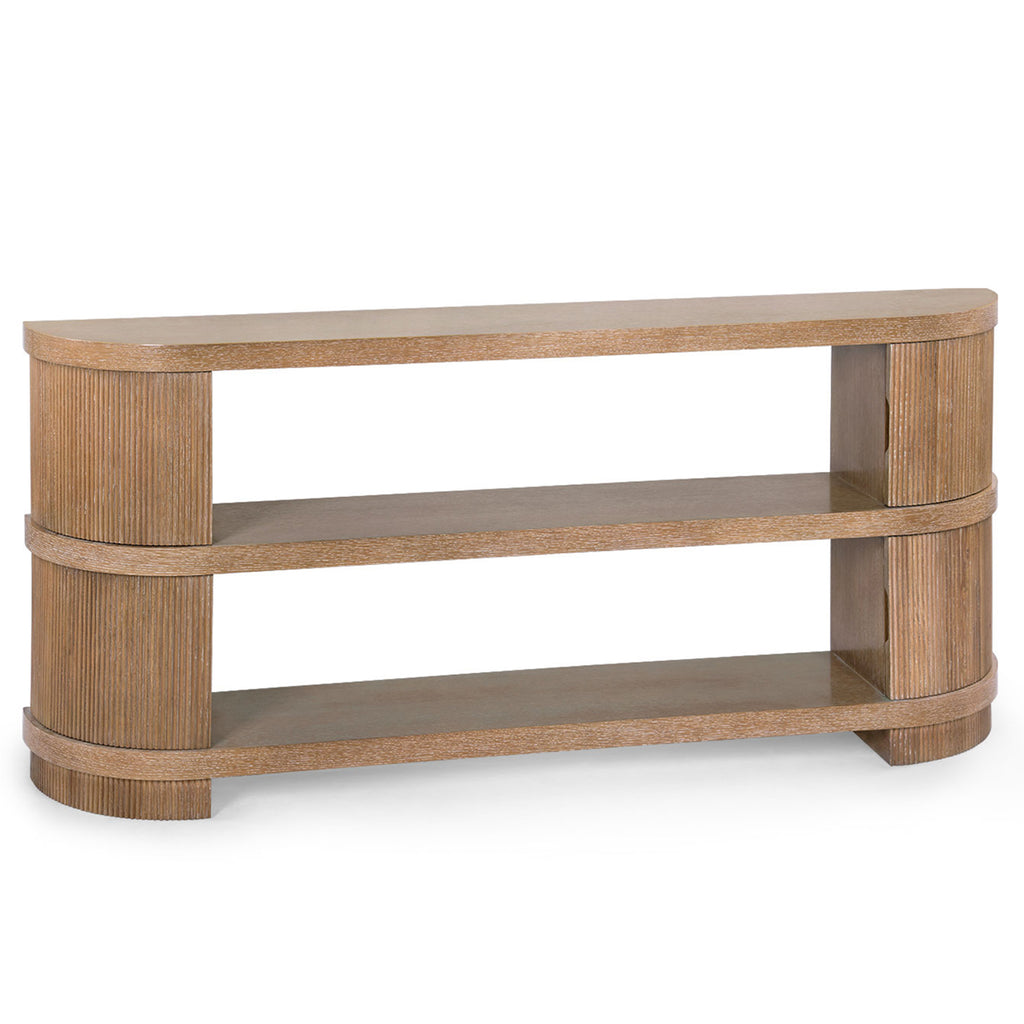 The Villa & House Atlas Console is a beautifully crafted oak piece that pairs architectural structure with thoughtful design details. Its three-tiered silhouette offers generous surface area for styling and storage, while its ends are elegantly rounded and finished with fluted panels that create a striking visual rhythm. Hidden cabinets on either side are seamlessly integrated, providing concealed storage without disrupting the console’s clean lines. With its graceful curves, layered shelving, and tactile finishes, the Atlas brings depth, utility, and sophistication to any space.
