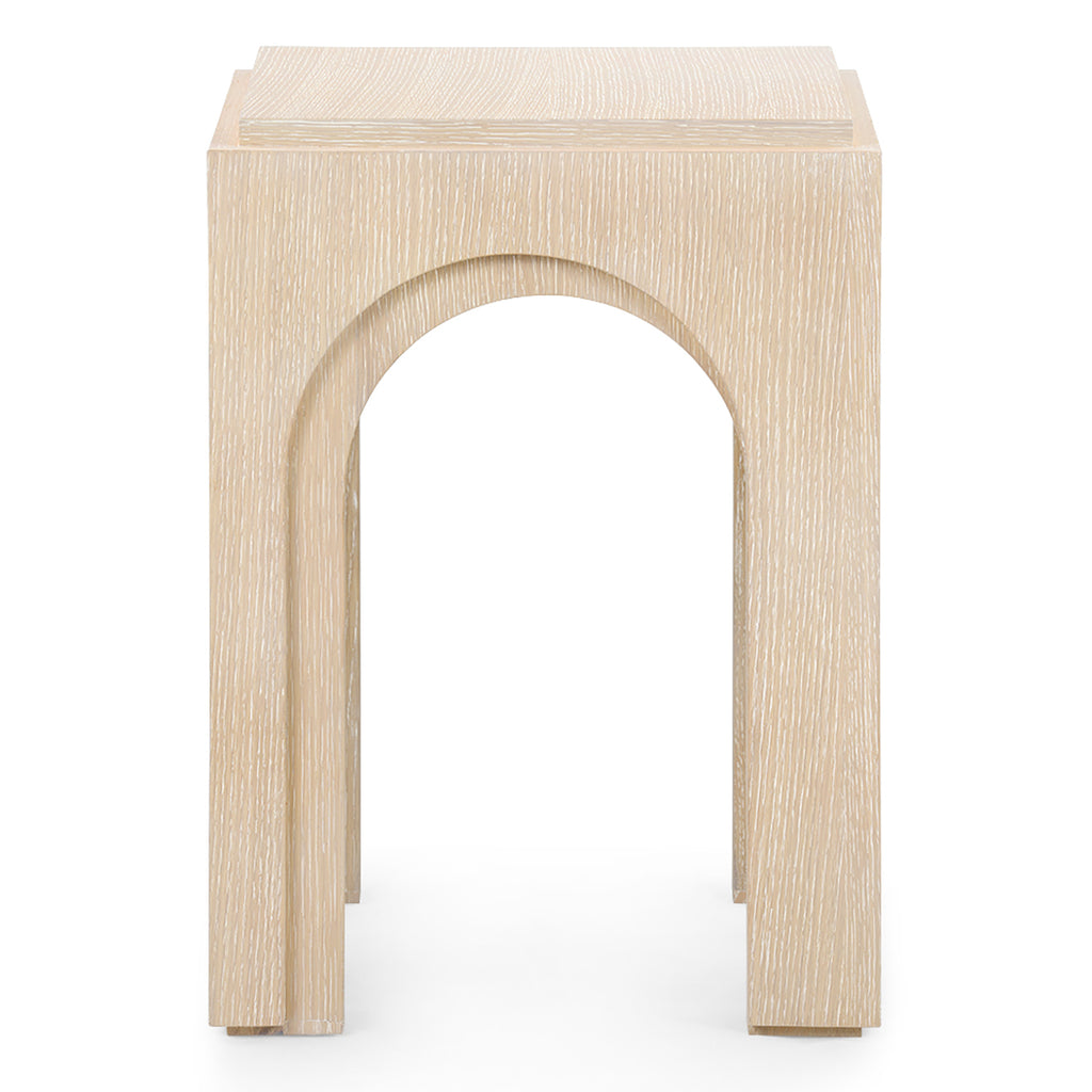 The Villa & House Dario Side Table distills the bold character of the collection into a compact, sculptural form. Crafted from bleached cerused oak, its square silhouette highlights the wood’s natural grain while maintaining a clean, modern profile. Each side features a striking tessellated arch pattern, creating a rhythmic visual effect that adds depth and dimension. The top is subtly elevated, giving the appearance of a floating platform and enhancing the table’s graphic appeal.
