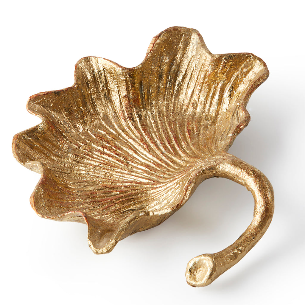 The Villa & House Ginko Bowl is composed of two separately gold-leafed cast metal leaves; delicate in design but durable in composition. Each bowl is detailed with the same veining and ripples one finds in nature. The Ginko bowls can be used individually or intertwined as 2 attached leaves and serve as decorative objet d’art and as functional catch-alls.