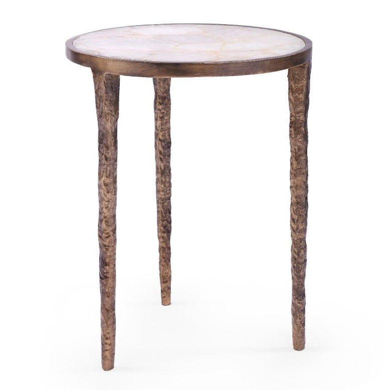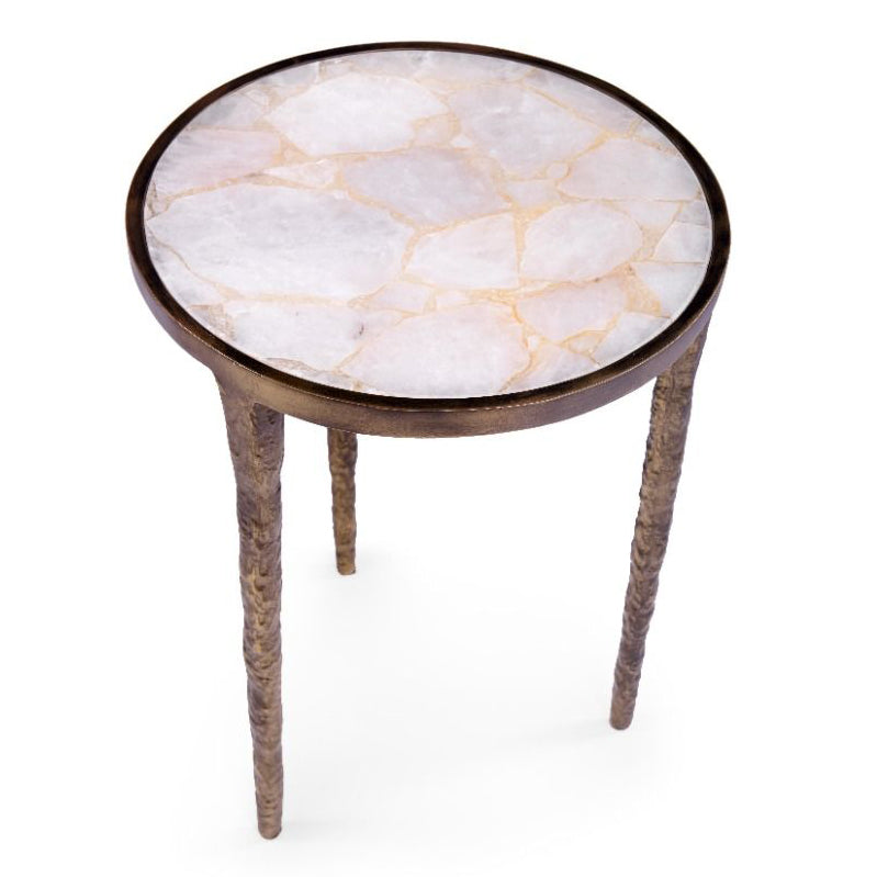 The beauty of rock crystal meets the fluid strength of iron in the Nora Side Table. Crystalline quartzite pieces are joined to make the glamorous table top which is mounted on an antique-brass finished base cast by hand to resemble molten metal. This quietly dramatic table can be used anywhere—as a cocktail table in a living room, an elegant accessory in the bathroom, or next to a reading chair in a study. Measuring 23.5 inches high and 16 inches in diameter, the Nora is the ultimate in a whimsical, artisanal, and stylish table.