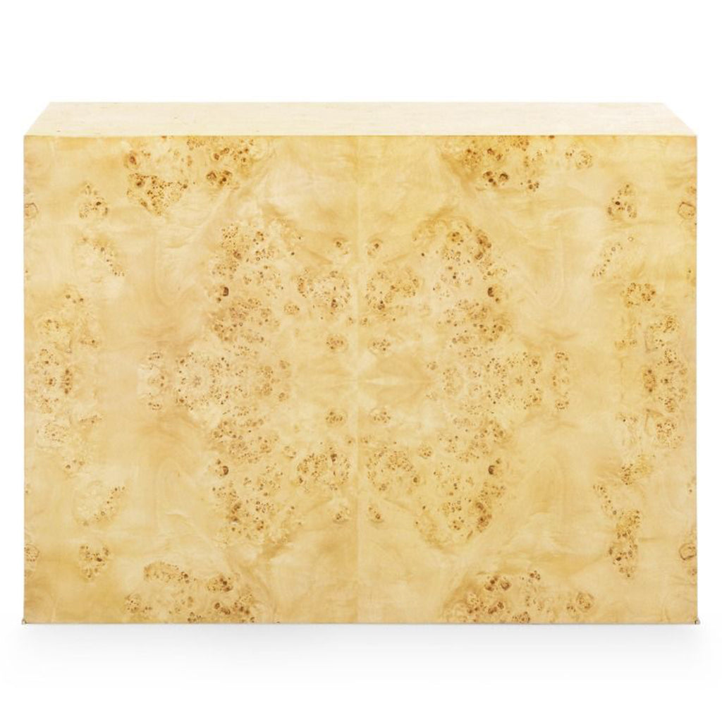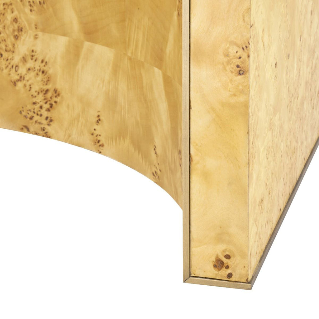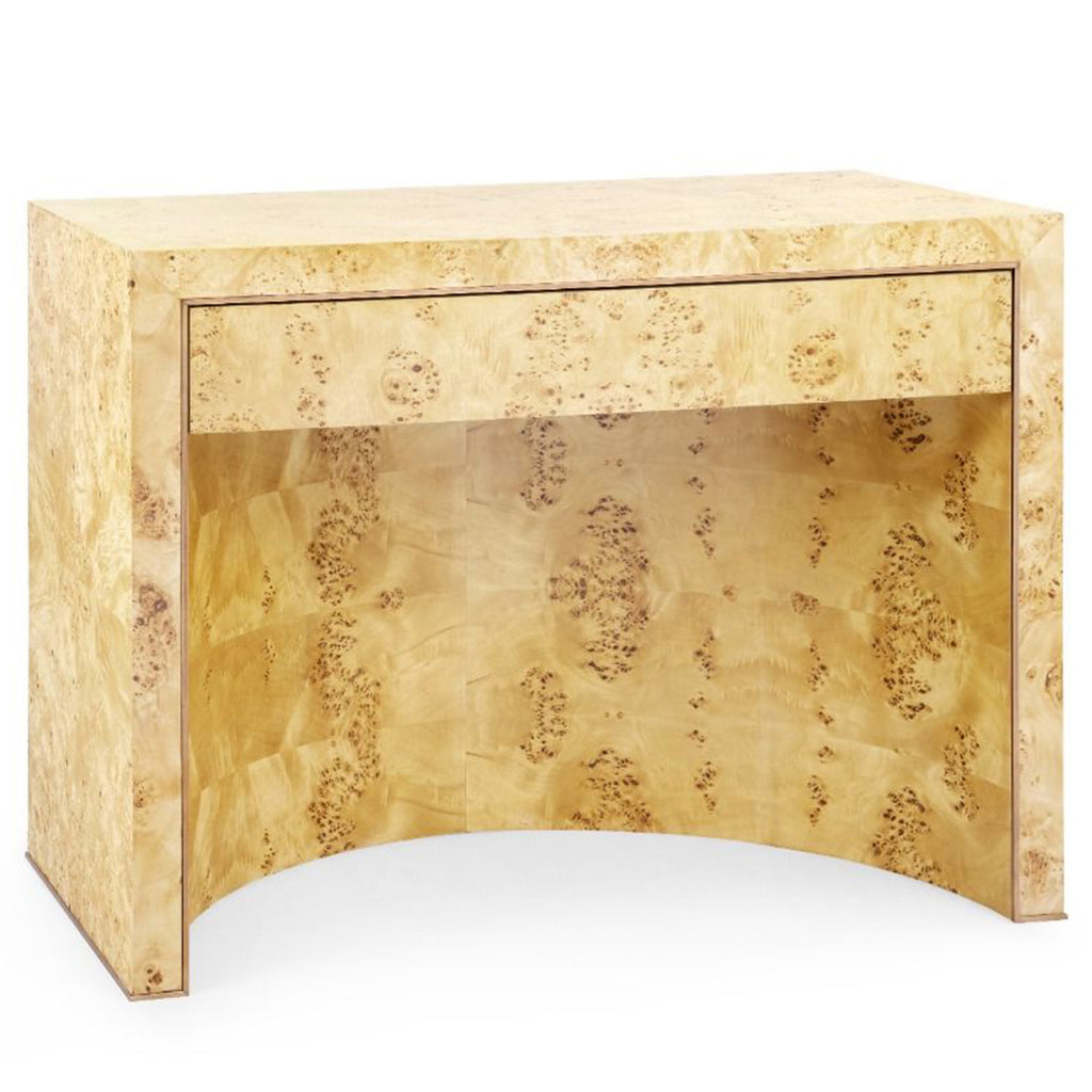 The Villa and House Sloane 1-Drawer Side Table is the epitome of timeless cool inspired by the iconic '60s-'70s era. Meticulously handcrafted from exquisite burlwood, its curved back and brushed brass border exude luxury. Its ample width invites creative styling, making it an impeccable choice as a nightstand, side table, or a statement piece for an entryway. Elevate your space with this elegant piece that seamlessly blends nostalgia with modern style.