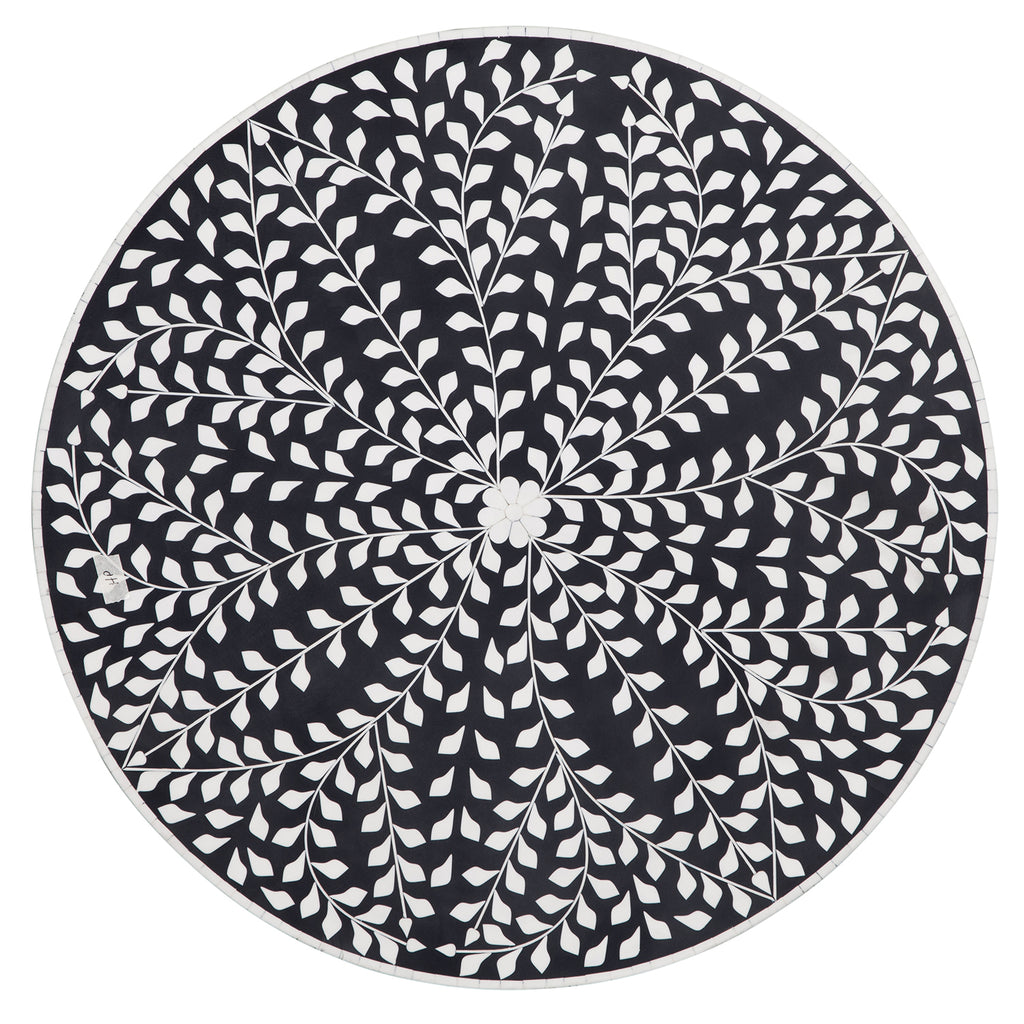 Everlasting Wall Art is a wooden round wall hanging with a black and white mosaic like floral design.