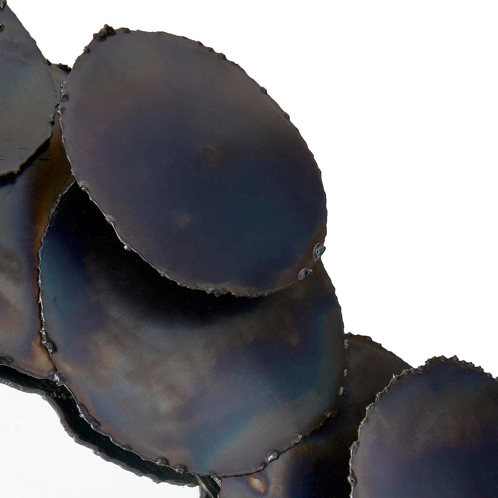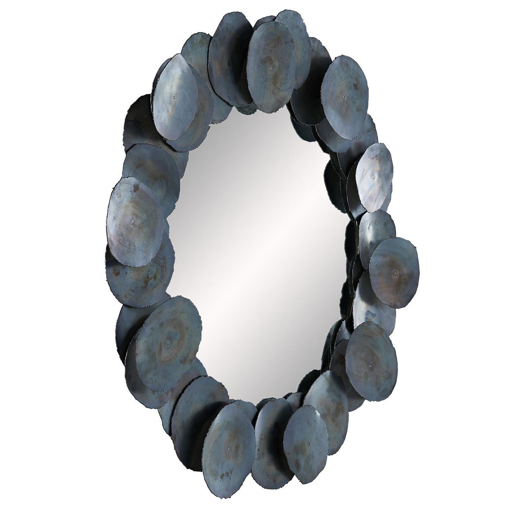 The Kensey Discs mirror takes over 20 large discs of iron to make each mirror and each disc must undergo an intensive process in order to get its interesting oxidized look. Discs are hand-cut, forming the raw edges, then given an oxidized finish with a chemical-and-fire technique. This free-hand artistry comes together to frame an industrial, rich mirror. Finish may vary.