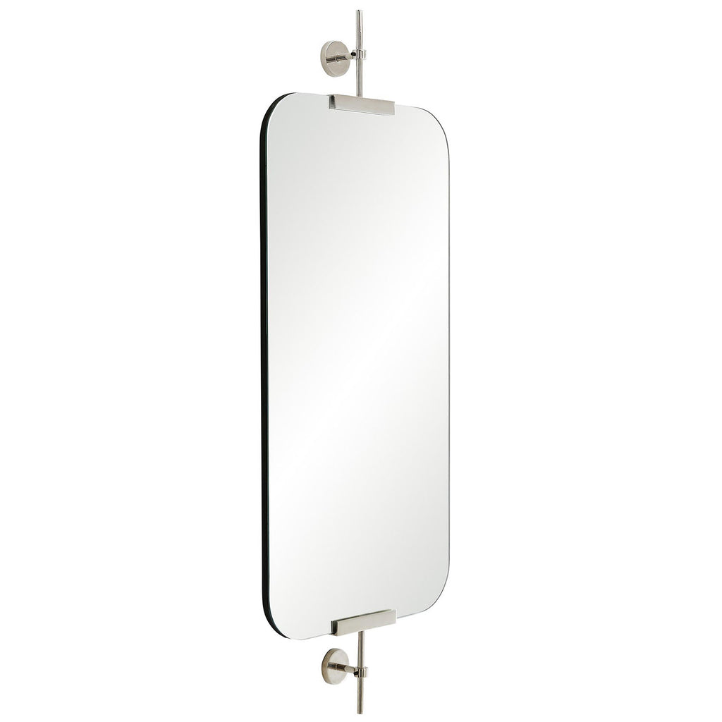 A floating mirror with rounded-edge plain glass, mounted via polished nickel brackets. Hangs vertically or horizontally. Finish will vary.