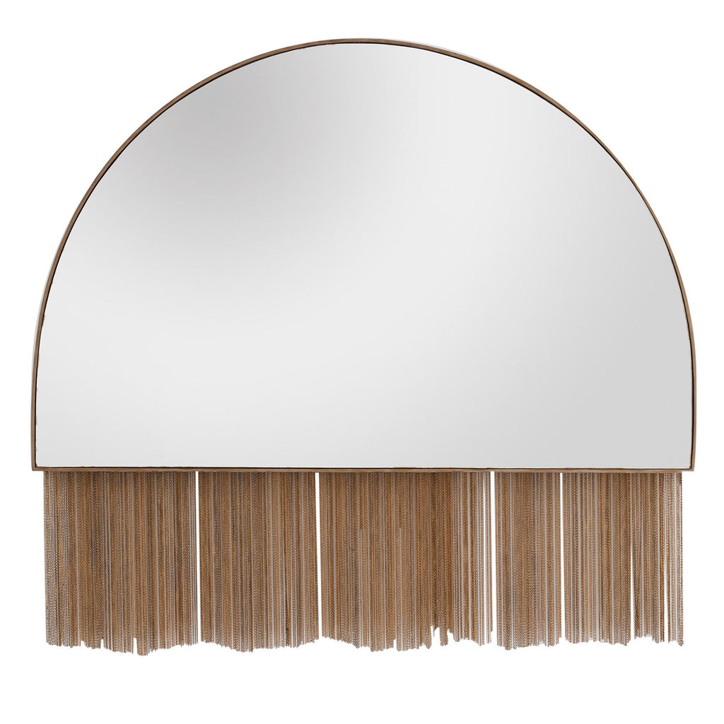 Exuding art deco glamour with a slight edge, this stunning mirror takes the spotlight. The demilune mirror is framed in antiqued brass iron with antiqued brass chain detailing that gives the piece a uniqueness look to any wall. Security cleat hanging hardware allows this mirror to hang vertically. Finish will vary.