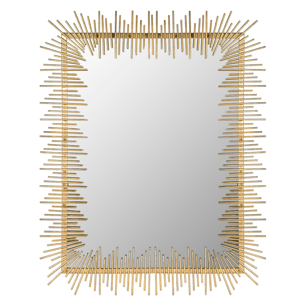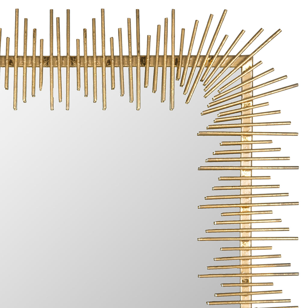 An innavative arrangement of broken lines lends intrigue to the rectangular Broeck mirror. Its sophisticated frame of antique gold-finished hand-forged iron updates the classic sunburst mirror for contemporary and transitional interiors.