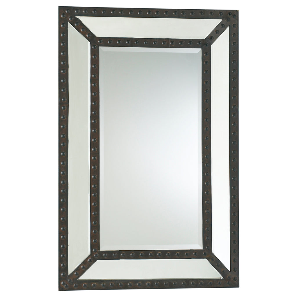 Long strips of mirrored glass from this rust mirror create a modern feel in any bathroom. A dark iron frame and studs add dimension and contemporize. The neutral colors complement existing decor.