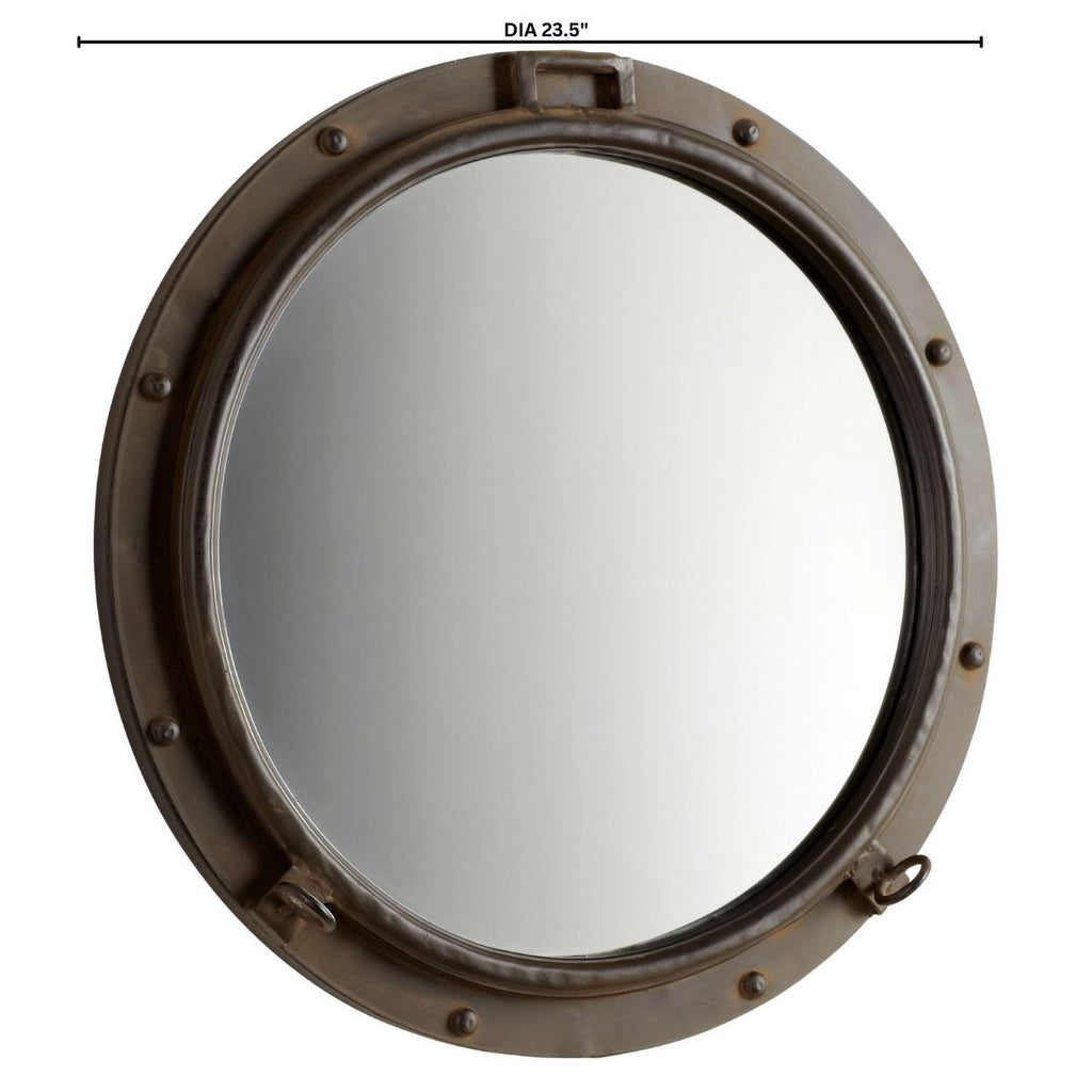 Go all-in on a nautical motif in any bedroom or bathroom with this rustic bronze porthole-inspired mirror. Intricate details such as studs and latches enhance the theme, while a simple circular frame stabilizes the contemporary aspect.