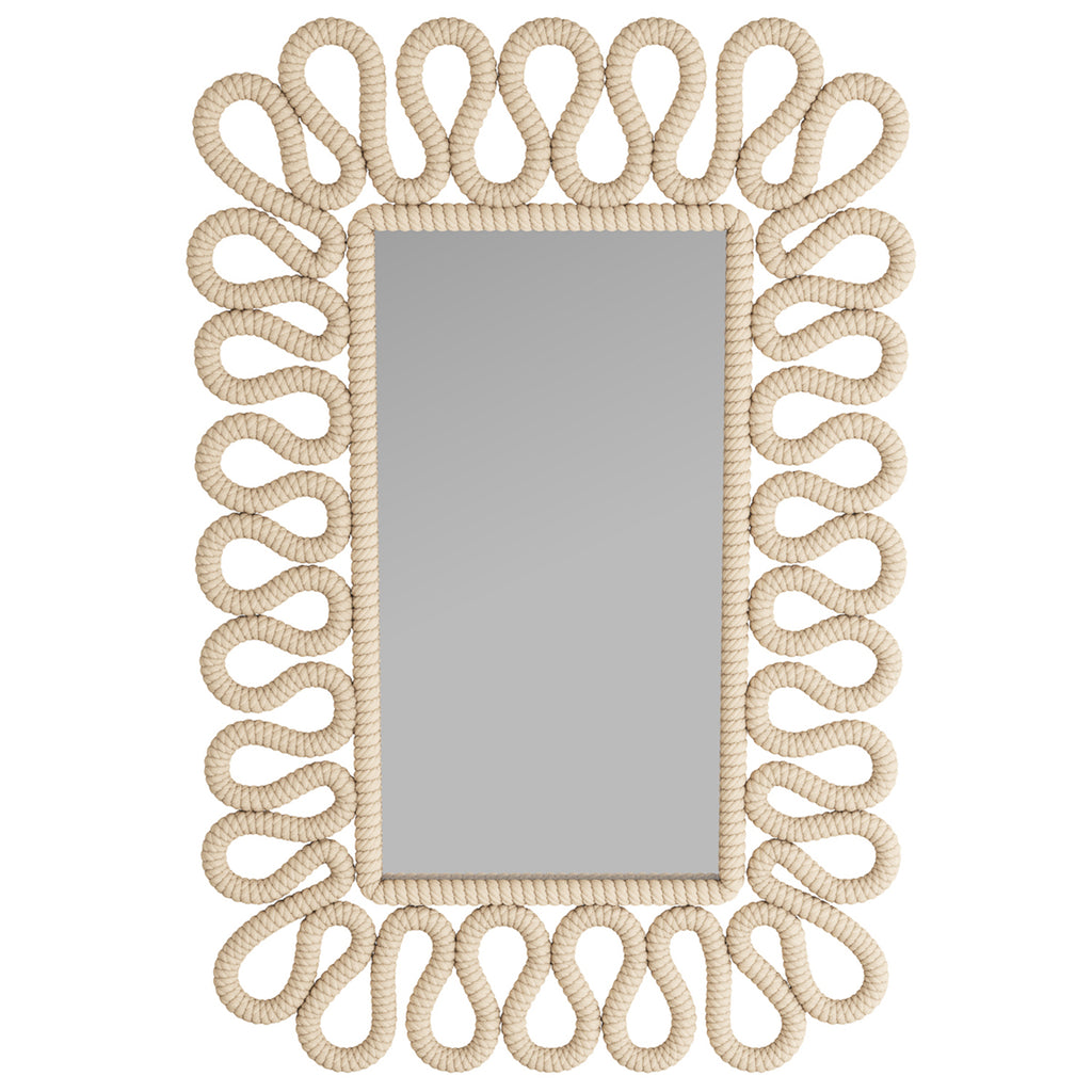 As a lyrical counterpoint, the ivory cotton rope lines of the Arteriors Caracol Mirror are like a sound wave; a fluid line wrapping around a rectangle; enough graphic impact to become artwork in the room or a playful frame to one’s reflection. Finish will vary.