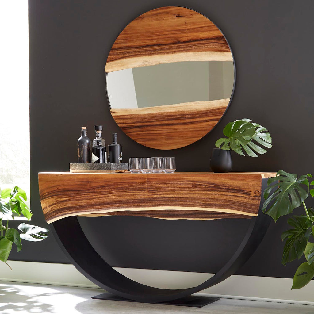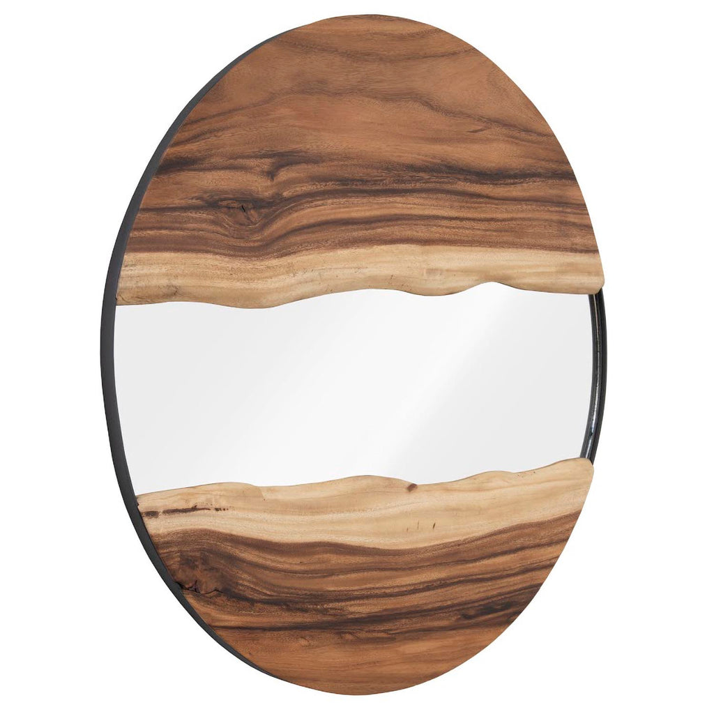 The combination of gleaming mirror and warm wood make the River Round Mirror a contrast in materials. We’ve designed the decorative mirror so that it is as much a piece of wall art as it is a looking glass. The panels of chamcha wood that flow along the top and bottom of the round mirror have a beautiful waviness to the grain that Mother Nature is so adept at achieving. This is one of our pieces that illustrates how we use nearly every length of the wood we harvest when we rescue them