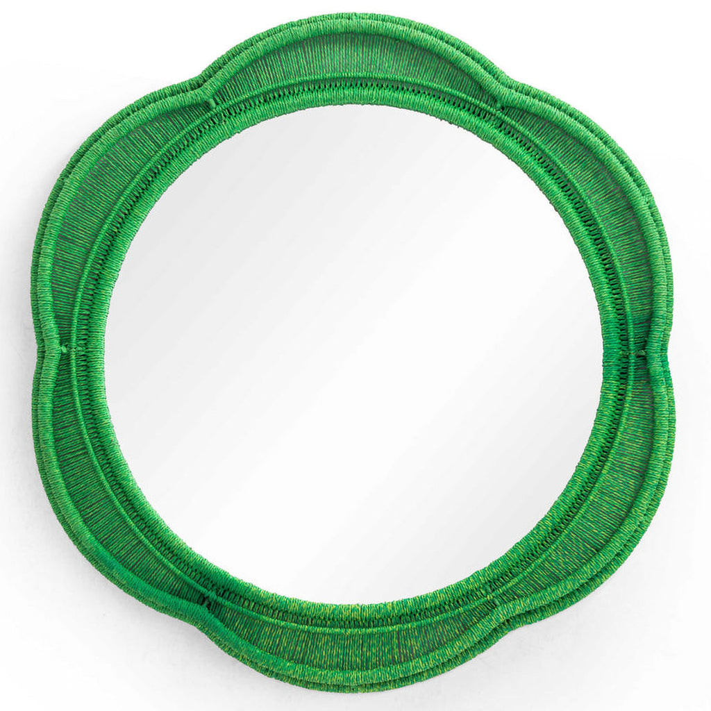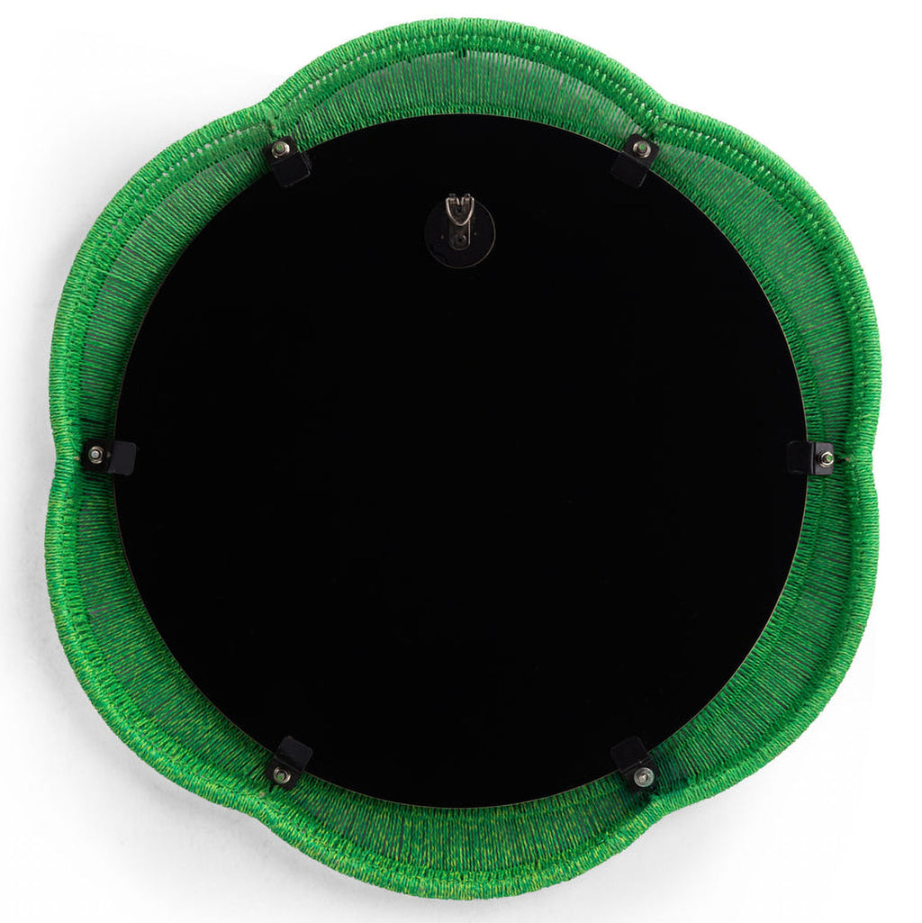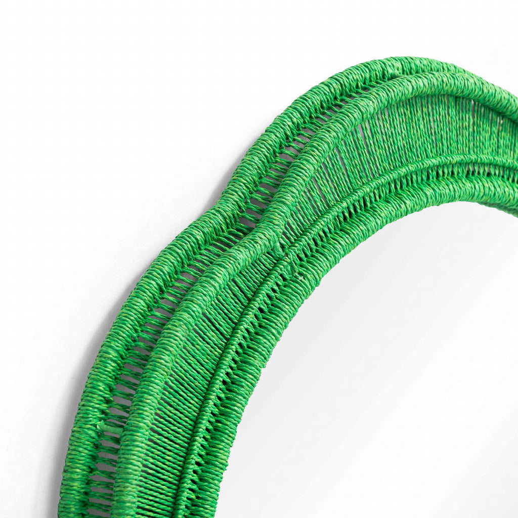 The Zeva Wall Mirror is a striking blend of artistry and bold color, featuring a hand-wrapped spun paper cord frame in green, red, or blue. At 20", it is the perfect statement piece, adding depth and drama to any space.