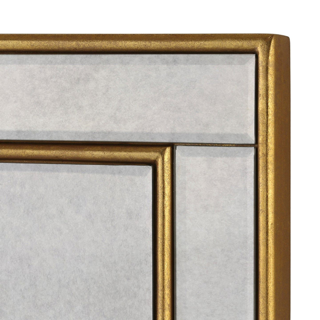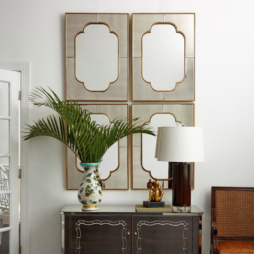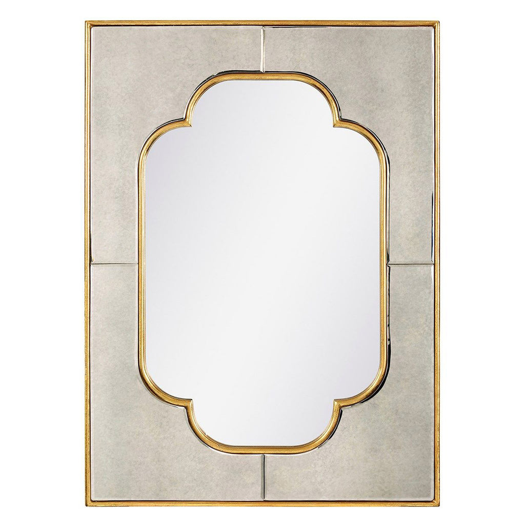 The V&H Cassia Mirror is an elongated quatrefoil, which is a classic design motif in European and Arabic cultures. The design deploys very sophisticated mixed materials by using beveled antique mirror to trace the quatrefoil, which is finished by a slender gold leaf outline. These sit atop clear glass for dimension and interest.