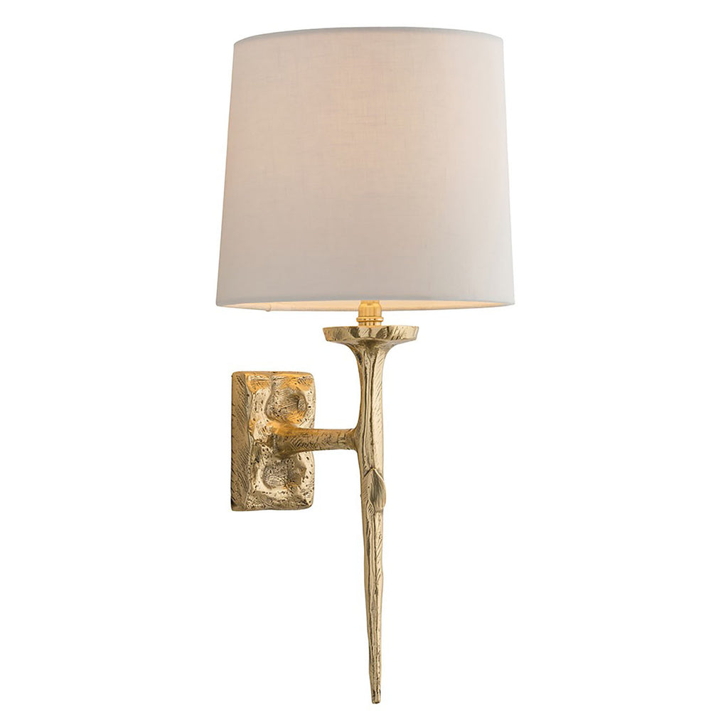 Brass has been cast to mimic molten metal in this romantic wall sconce. The fluid nature of the matte brass is evocative of Salvador Dali’s surreal designs. Topped with an off-white linen Uno mounted shade—finish will vary.