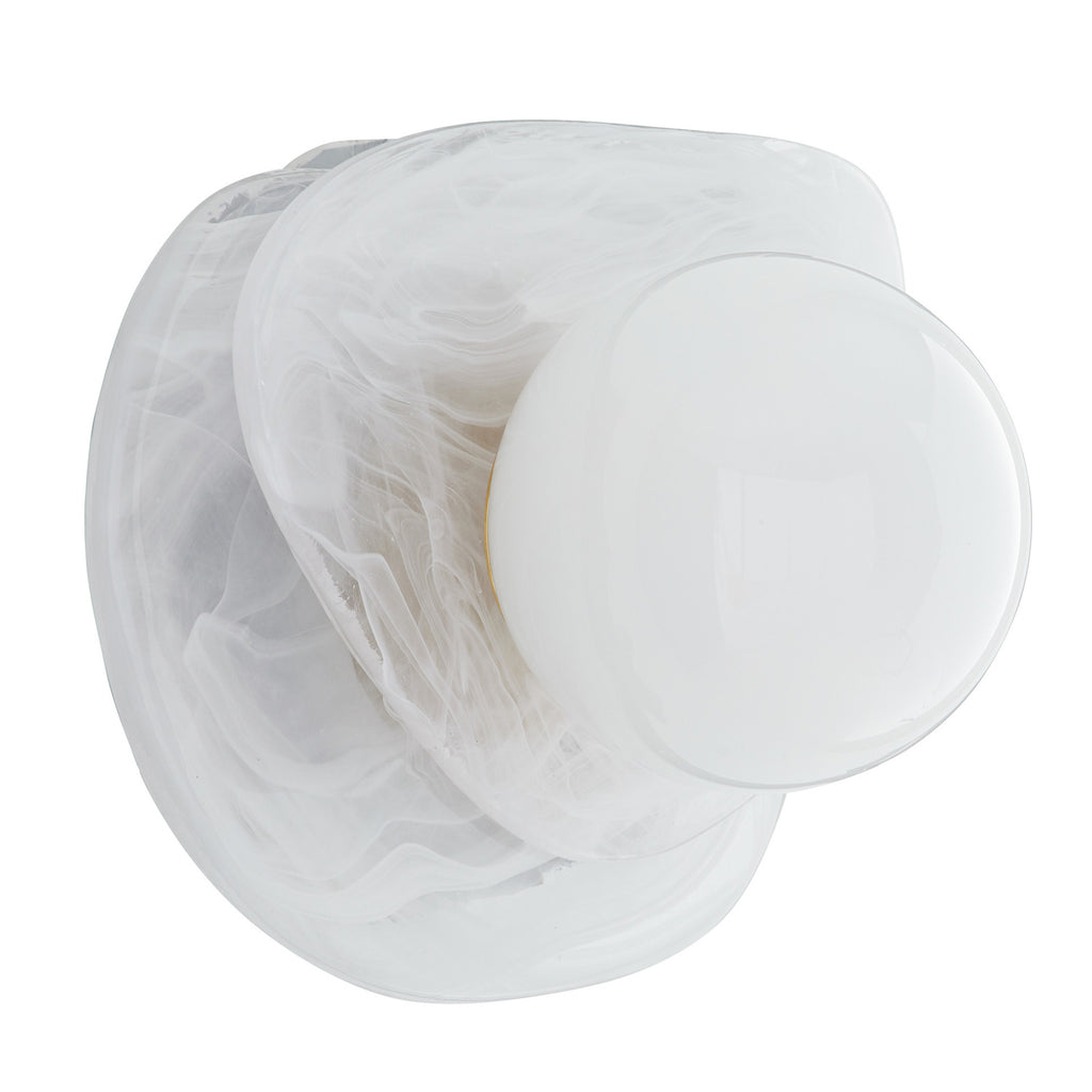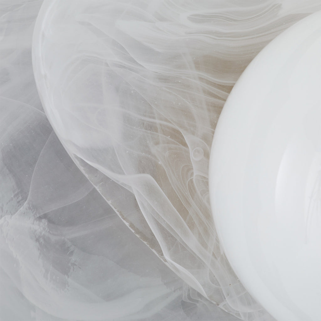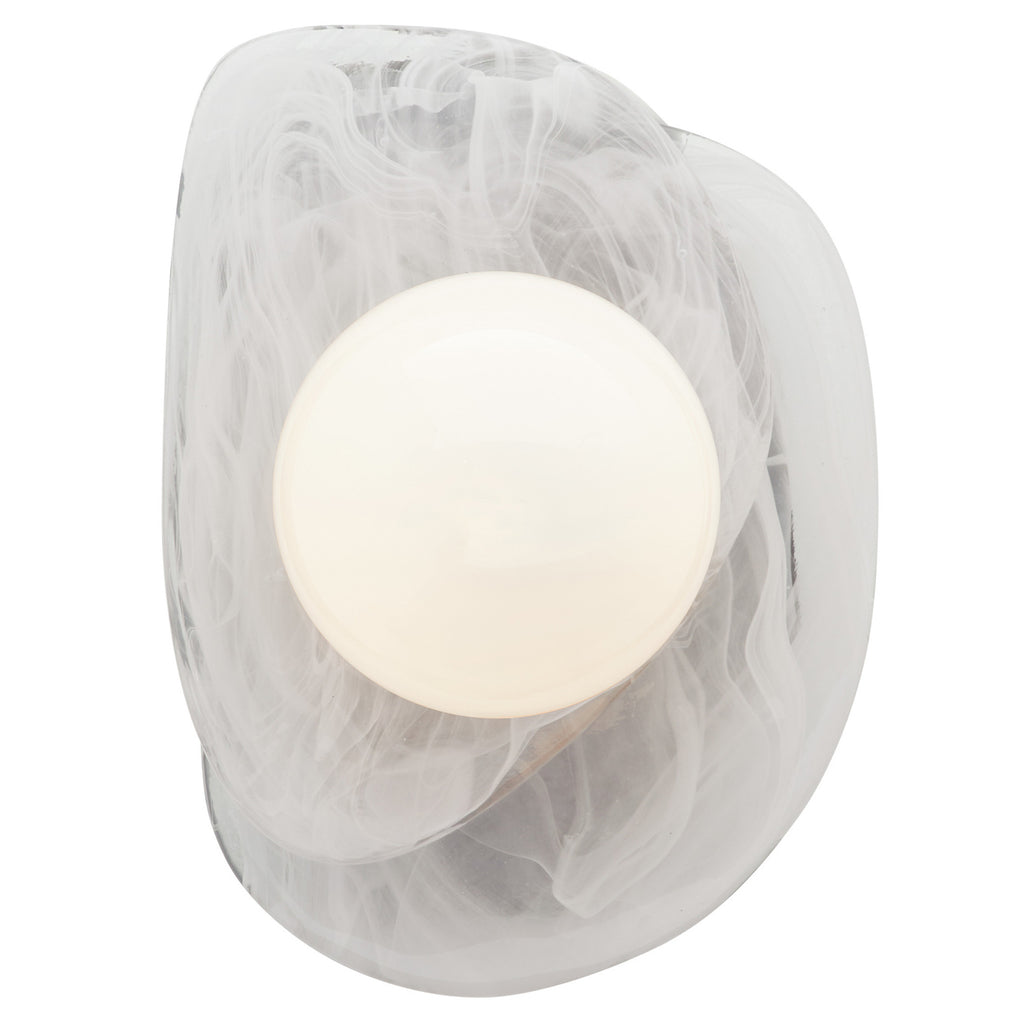 Mimicking a pearl inside an oyster’s shell, an opal glass orb is mounted to a hand-blown swirl glass fixture and secured to a brass-plated iron backplate—this jewel-like light can be hung in any direction. Damp-rated, although limited covered outdoor areas may affect finish; finish will vary.