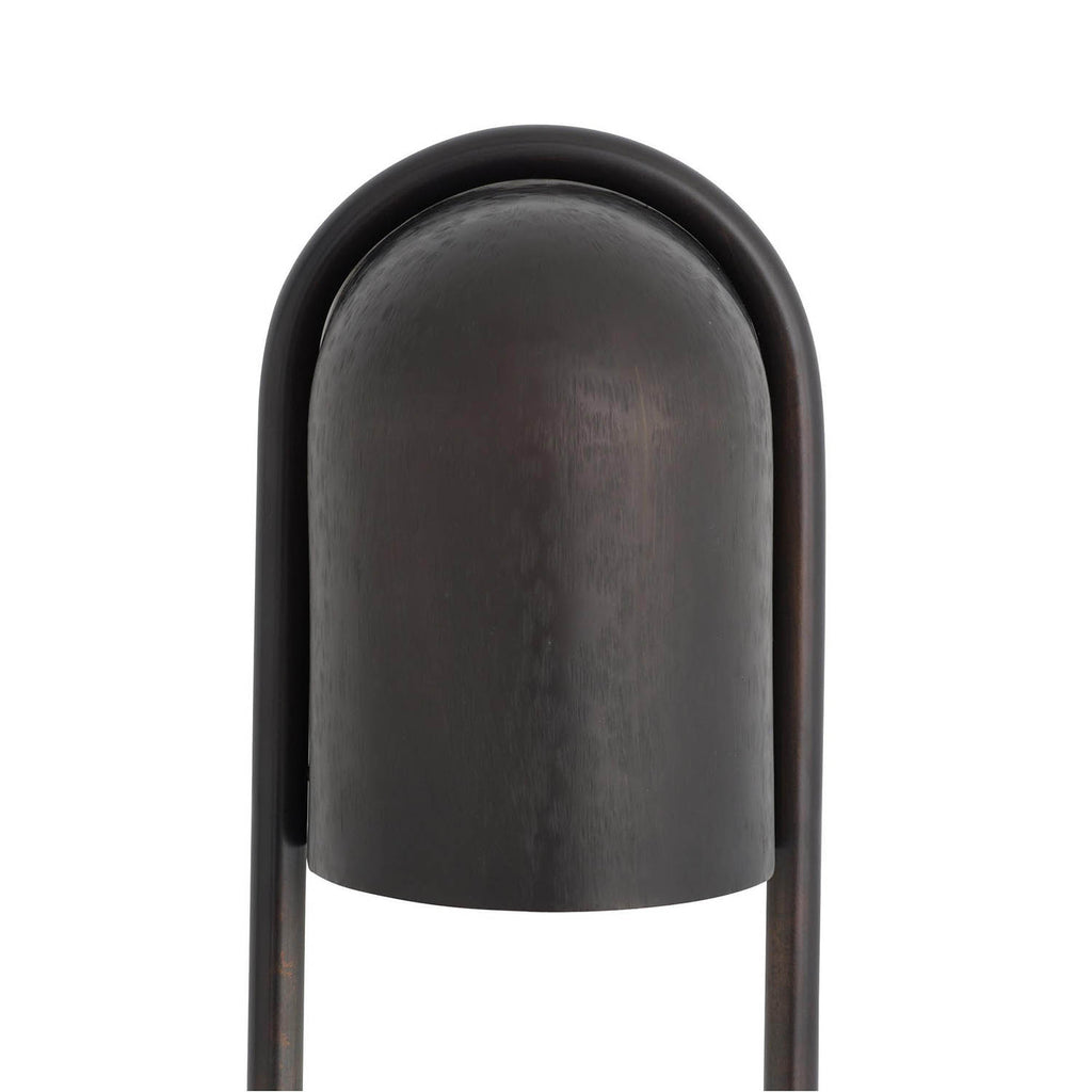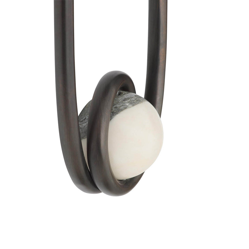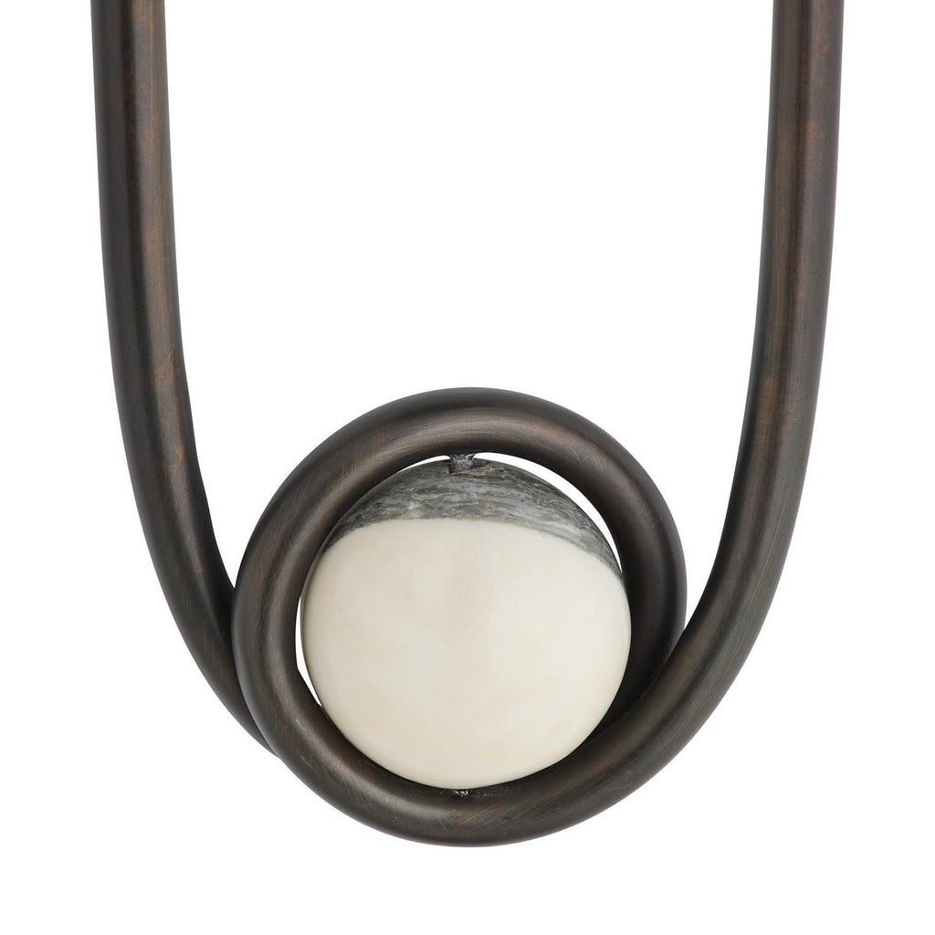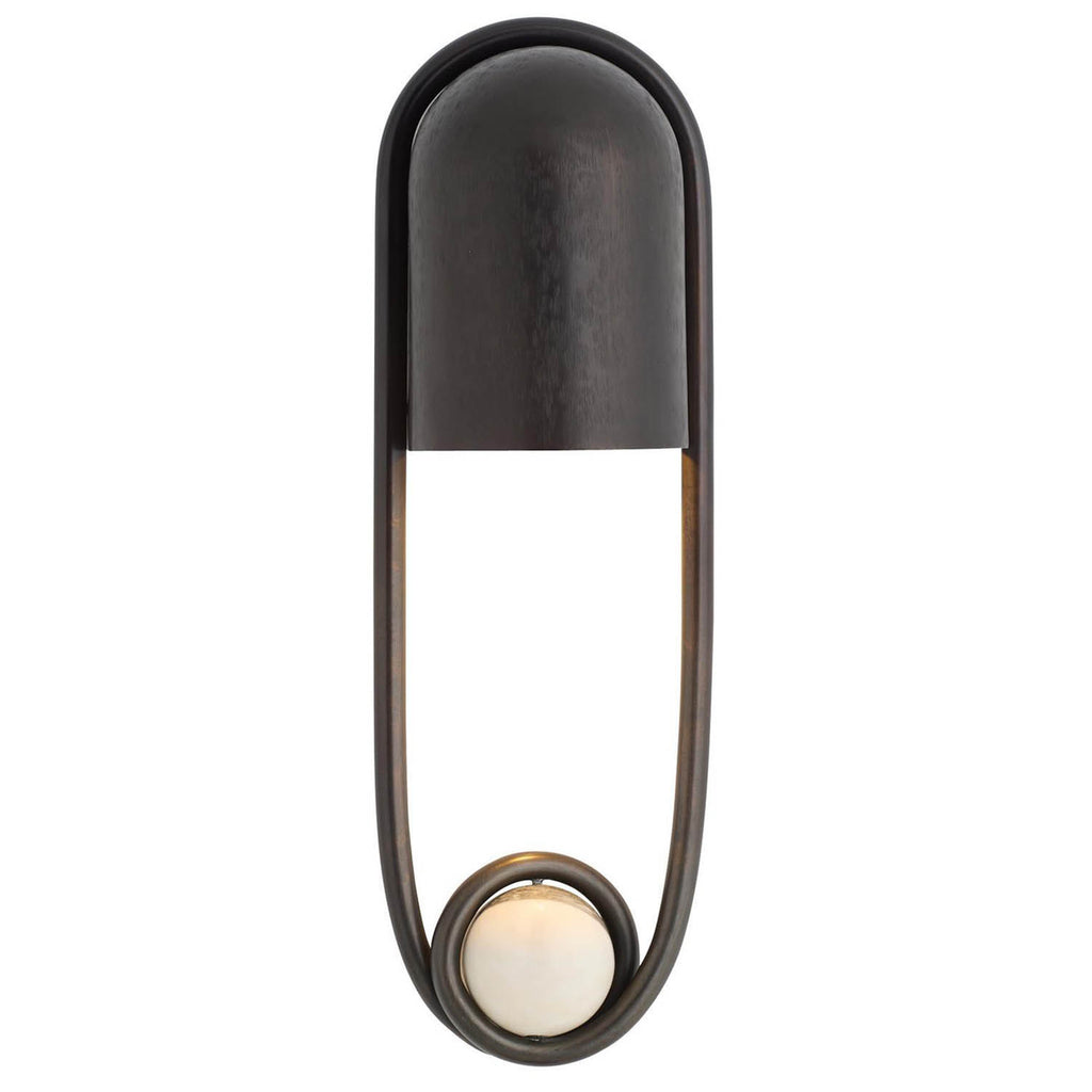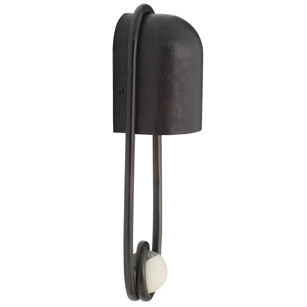 A stirrup-shaped sconce captures a white and gray marble sphere in a loop of chattered English bronze-plated steel. The hooded silhouette is designed to cast a moody, atmospheric wash of light—ideal in multiples. Damp-rated; finish will vary.
