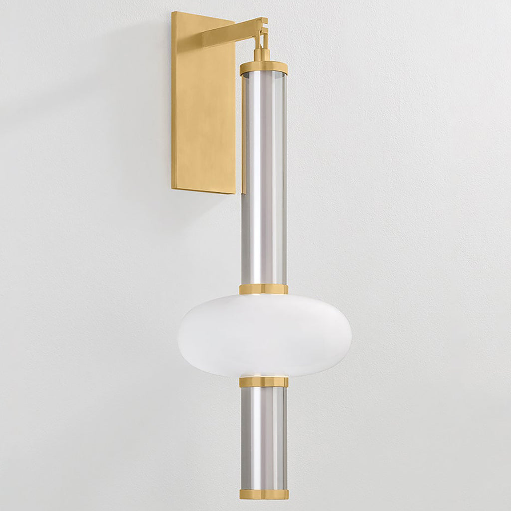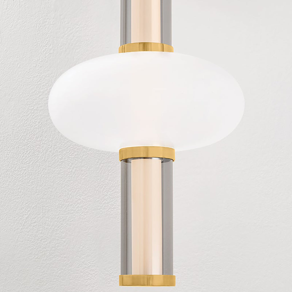 A study in layering, transparency, and colored glass techniques, Corbett Lighting Corbin has an ethereal windchime-like silhouette. The central tubes are accented by large oblong shades resembling beads on a necklace. These modern forms are enhanced by the use of clear and tinted ombre glass, which creates a stunning display when illuminated by the central LED tube. Corbin is available as a 1-light pendant, 1-light sconce, and 3-light chandelier.
