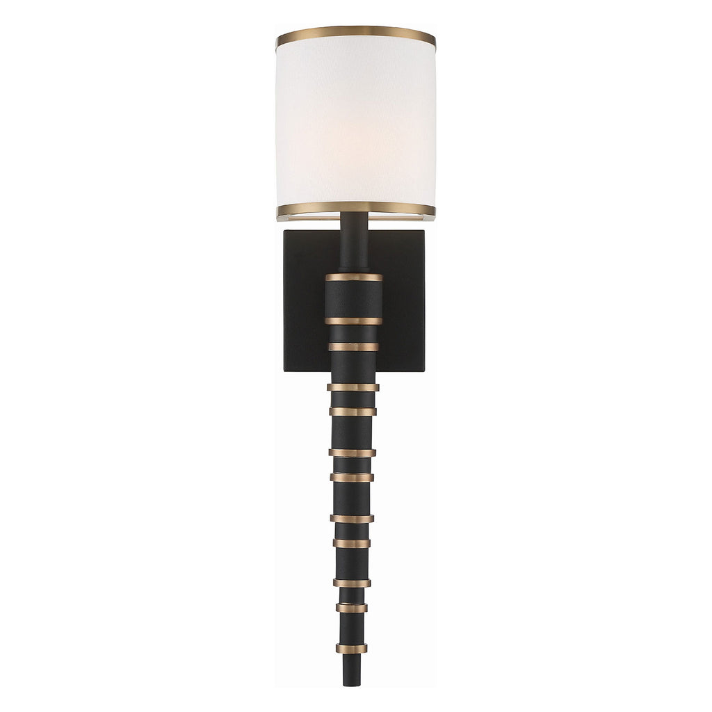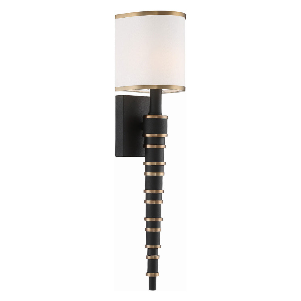 Crystorama is known for its standout lighting, which is exceptional in quality and design. From traditional all-crystal designs to transitional lighting collections, Crystorama offers styles that will match any décor and are always in fashion. Add elegance and sophistication to a room with the Sloane vibrant gold and black forged metal wall sconce. It's elongated tapered arm, and cylindrical white silk shade is an effortless way to add visual interest to your wall. Sloane collection features a versatile modern / contemporary design. A merging of design utilizing minimalist styling and clean lines that add visual appeal to a space. White enclosed glass; shade included. Vibrant Gold metal finish mixed with Black Forged deep black finish provides a vivid splash of contrast to a room's décor. These finishes work beautifully together and perfect for a variety of décor aesthetics.
