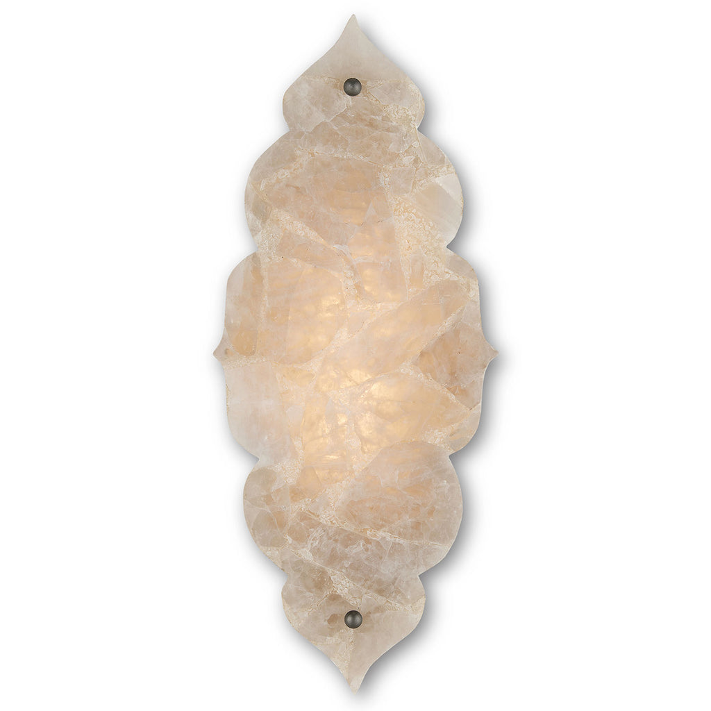 The Currey & Co Andalusia Wall Sconce is a gem of a fixture with its Moroccan-inspired shape and composite quartz stone covering the light source. The backplate and nuts that fasten the luminous shade to the sconce and the wall are in a Hiroshi Gray finish. The interior of the wrought-iron sconce is in a sugar white finish to enhance the glow. The sconce is ADA compliant.