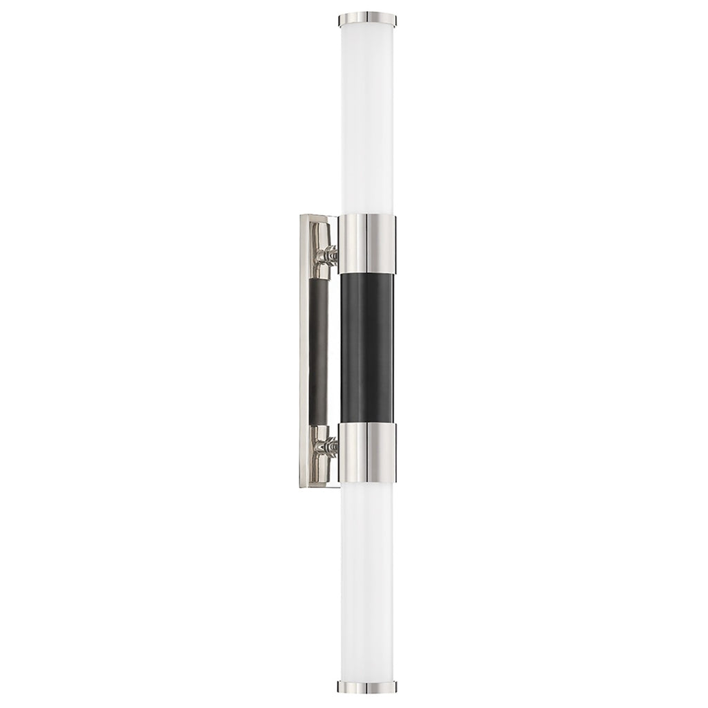 Hudson Valley Lighting Huntington is linear lighting at its best. Milk glass tubes capped in metal sprout from each end of a similarly capped soft black shade creating a luxe layered look. This streamlined collection has a slender silhouette that works well in any space. Choose from Aged Old Bronze or Polished Nickel finishes with Soft Black accents.