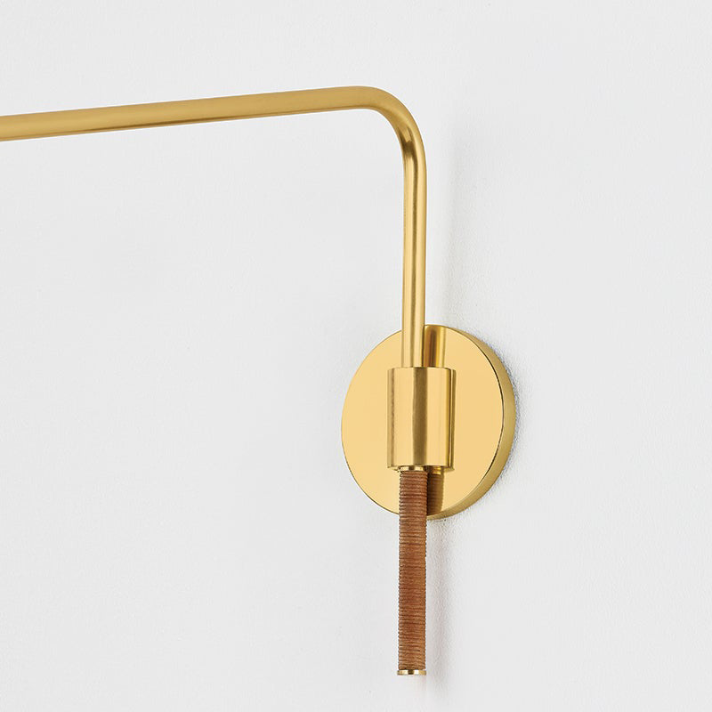 The Hudson Valley Lighting Narragansett family tells an innovative design story marked by the use of tactile materials. While the silhouette of this sconce and floor lamp are understated, the Aged Brass metalwork and rattan-wrapped details mix hard and soft, manmade and natural. The elongated swing arm feature makes Narragansett perfect for bedside, desk, or reading nook illumination.